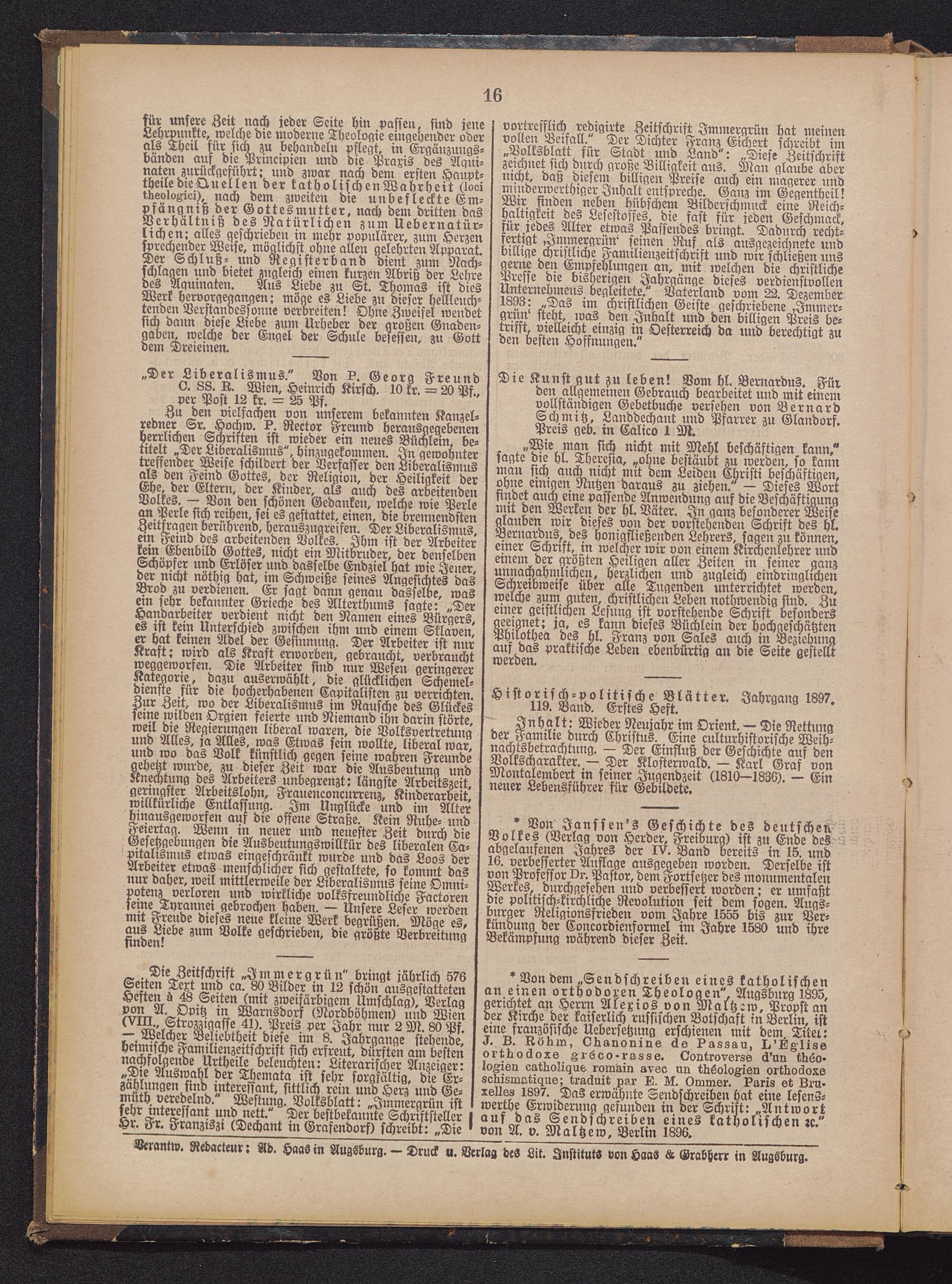 * Von Janssen's Geschichte des deutschenVolkes (Verlag von Herder, Freiburg ) ist zu Ende desabgelaufenen Jahres der IV. Band bereits in 15. und16. verbesserter Auflage ausgegeben worden. Derselbe istvon Professor Dr. Pastor, dem Fortsetzer des monumentalenWerkes, durchgesehen und verbessert worden; er umfaßtdie politisch-kirchliche Revolution seit dem sogen. Augs-burger Religionsfrieden vom Jahre 1555 bis zur Ver-künoung der Concordienformel im Jahre 1580 und ihreBekämpfung währmd dieser Zeit.