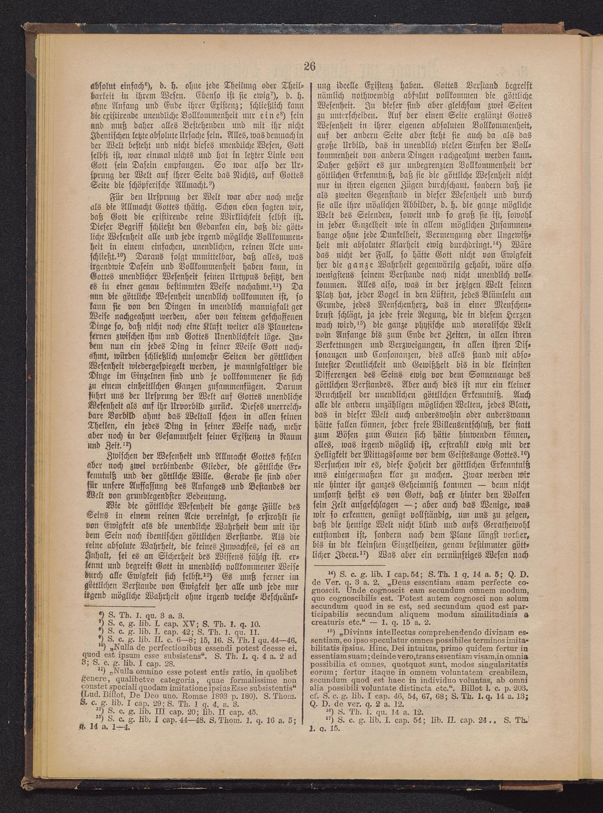 absolut einfach"), d. h. ohne jede Theilung oder Teil-barkeit in ihrem Wesen. Ebenso ist sie ewig?), d. h.ohne Anfang und Ende ihrer Existenz; schließlich kanndie existirende unendliche Vollkommenheit nur eine") seinund muß daher alles Bestehenden und mit ihr nichtIdentischen letzte absolute Ursache sein. Alles, was demnach inder Welt besteht und nicht dieses unendliche Wesen, Gott selbst ist, war einmal nichts und hat in letzter Linie vonGott sein Dasein empfangen. So war also der Ur-sprung der Welt auf ihrer Seite das Nichts, auf GottesSeite die schöpferische Allmacht. °)