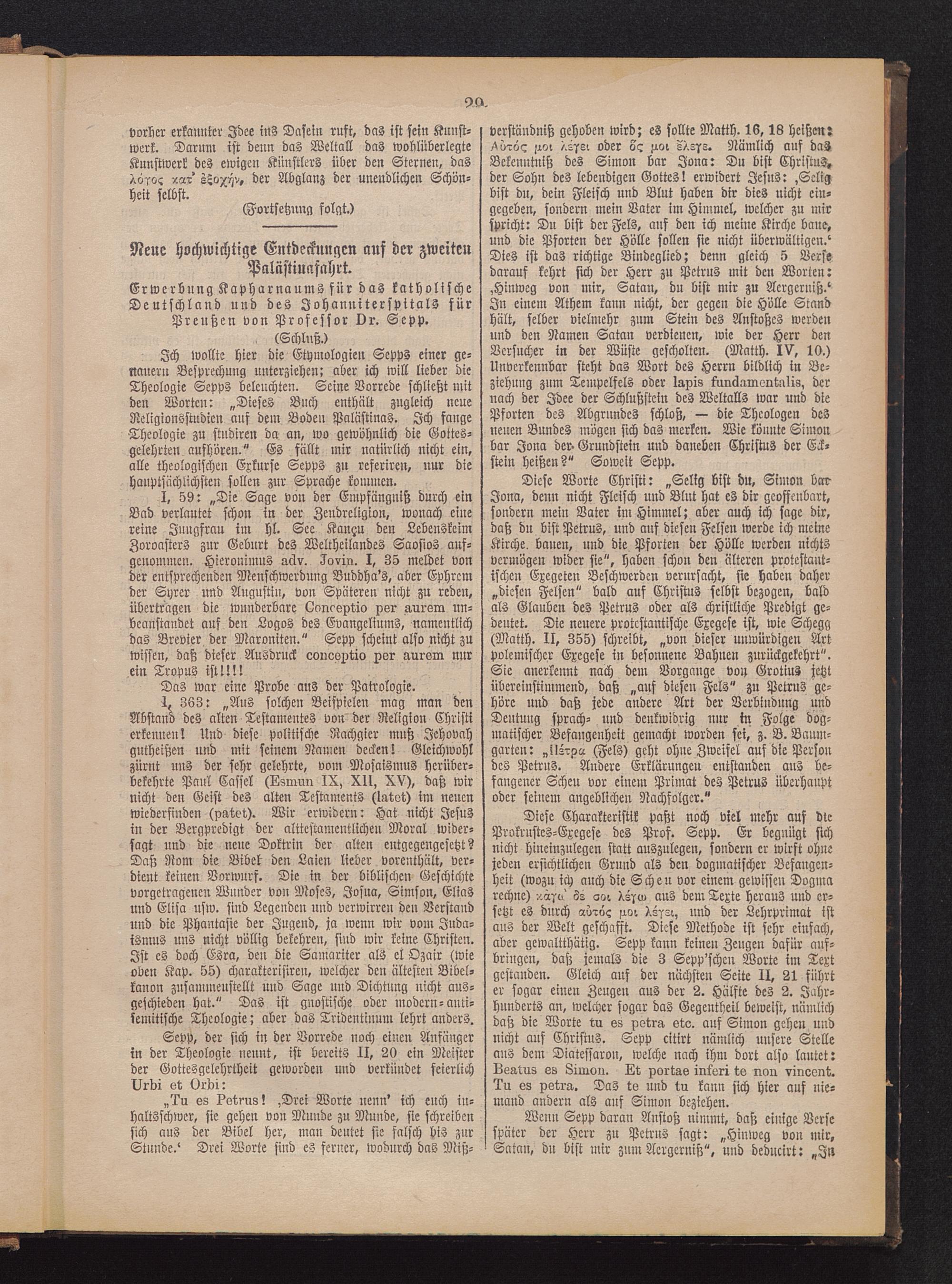 Diese Charakteristik paßt noch viel mehr auf dteProkrustcs-Exegese des Pros. Sepp. Er begnügt sichnicht hineinzulegen statt auszulegen, sondern er wirft ohnejeden ersichtlichen Grund als den dogmatischer Befangen-heit (wozu ich auch die Scheu vor einem gewissen Dogmarechne) ös c-c->. X- 70 , ans dem Texte heraus und er-setzt es durch sroe Xs-sTl, und der Lehrprimat istaus der Welt geschafft. Diese Methode ist sehr einfach,aber gewaltthätig. Sepp kann keinen Zeugen dafür auf-bringen, daß jemals die 3 Sepp'schen Worte im Textgestanden. Gleich auf der nächsten Seite II, 21 führter sogar einen Zeugen aus der 2. Hälfte des 2. Jahr-hunderts an, welcher sogar das Gegentheil beweist, nämlichdaß die Worte tu es petra eto. auf Simon gehen undnicht auf Christus. Sepp citirt nämlich unsere Stelleans dem Diatessarou, welche nach ihm dort also lautet:Leatus es Liiuou. Lt portas iukeri ts neu viuovut.1u es petra. Das te und tu kaun sich hier auf nie-mand andern als auf Simon beziehen.