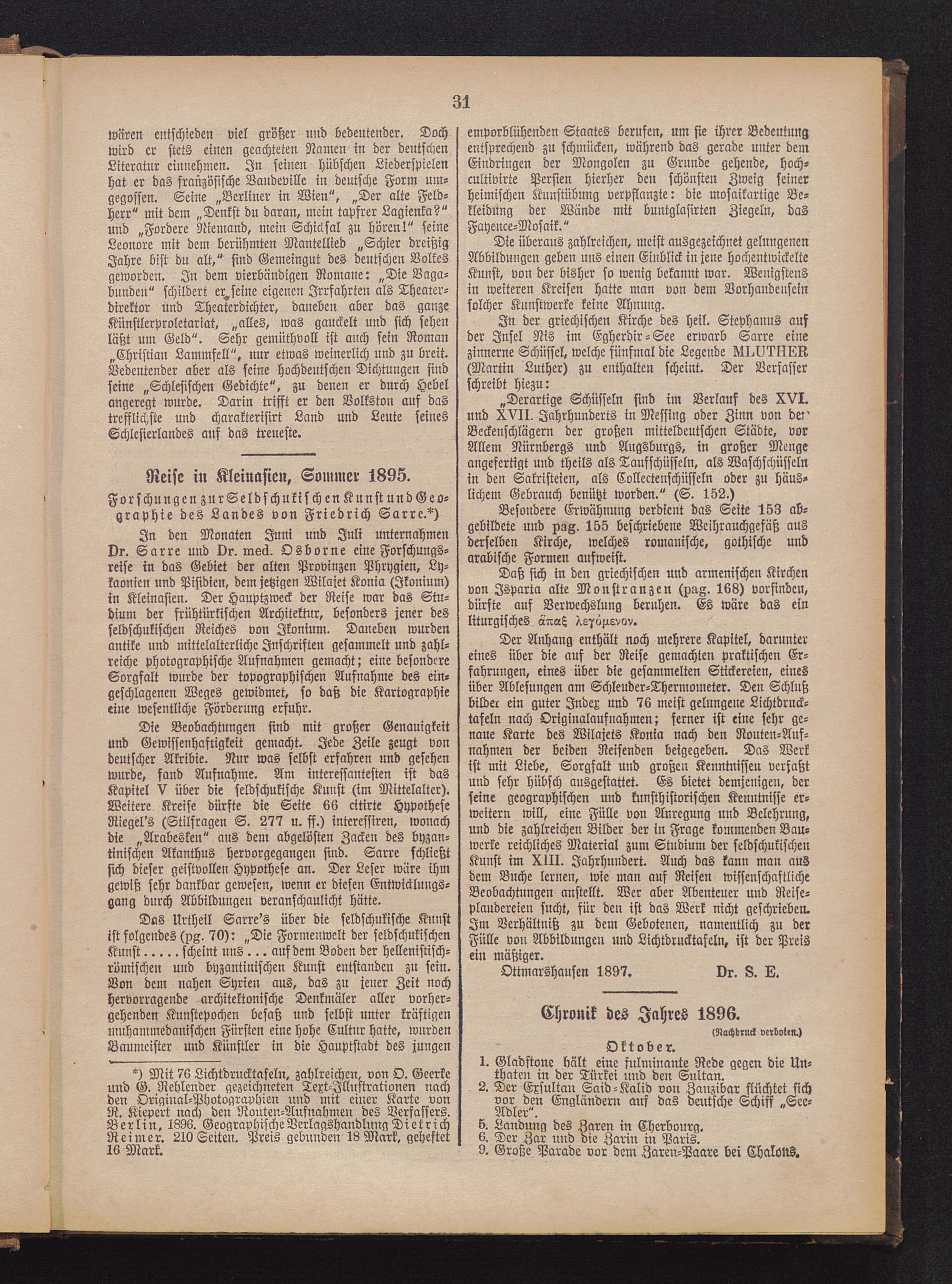 '-) Mit 76 Lichtdrucktafeln, zahlreichen, von O. Geerkeund G. Rehlender gezeichneten Text-Illustrationen nachden Original-Photographien und mit einer Karte vonR. Kiepert nach den Nouten-Aufnahmen des Verfassers.Berlin, 1896. Geographische Verlagshandlung DietrichReimer. 210 Seiten. Preis gebunden 18 Mark, geheftet16 Mark.
