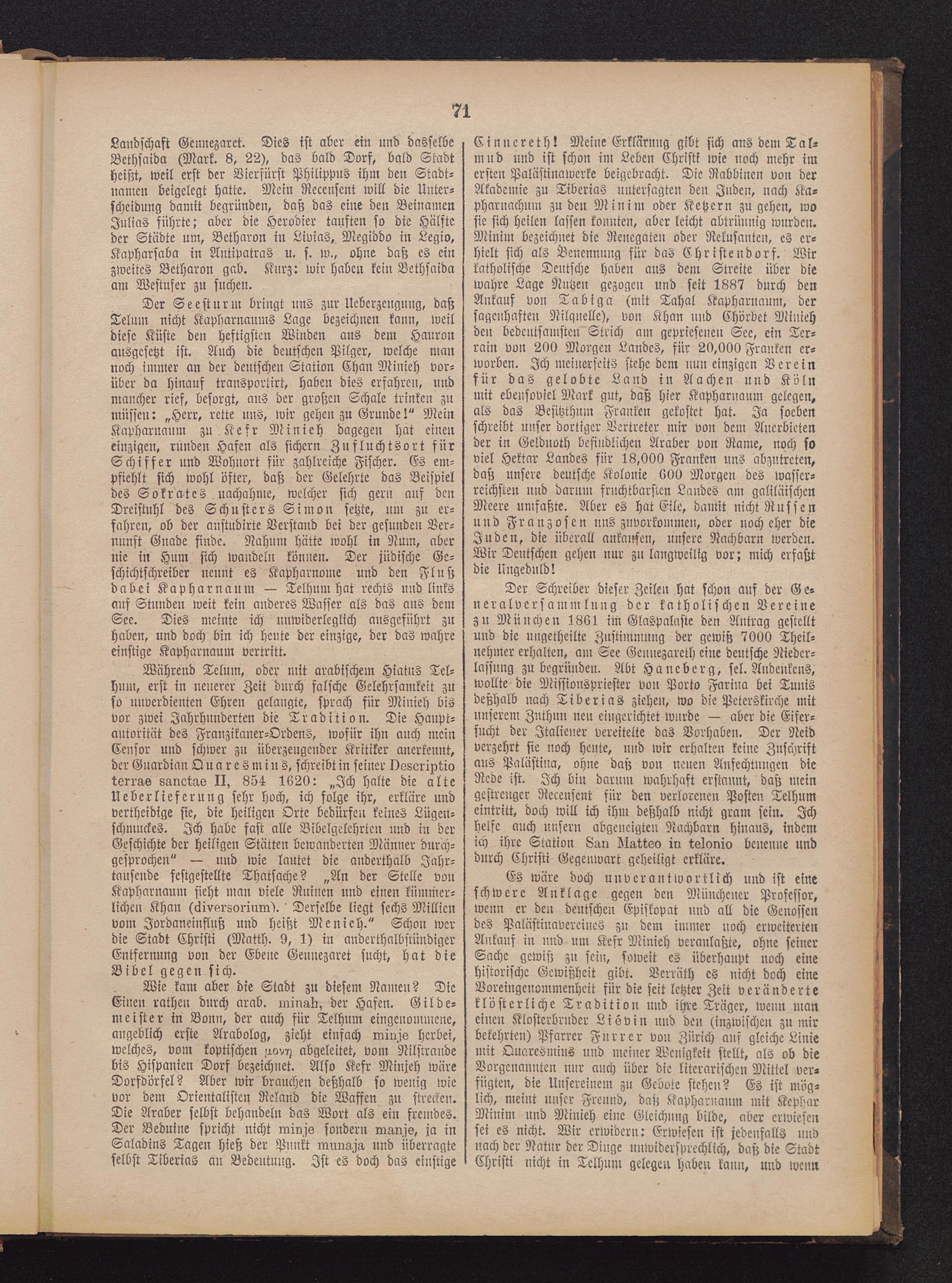 Der Schreiber dieser Zeilen hat schon auf der Ge-neralversammlung der katholischen Vereinezu München 1861 im GlaSpalaste den Antrag gestelltund die nngetheilte Zustimmung der gewiß 7000 Theil-nehmer erhalten, am See Gennezareth eine deutsche Nieder-lassung zu begründen. Abt Haneberg, sel. Andenkens,wollte die Missionsvriester von Porto Farina bei Tunis deßhalb nach Tiberias ziehen, wo die Peterskirche mitunserem Zuthun neu eingerichtet wurde — aber die Eifer-sucht der Italiener vereitelte das Vorhaben. Der Neidverzehrt sie noch heute, und wir erhalten keine Zuschriftaus Palästina, ohne daß von neuen Anfechtungen dieRede ist. Ich bin darum wahrhaft erstaunt, daß meingestrenger Recensent für den verlorenen Posten Telhnmeintritt, doch will ich ihm deßhalb nicht gram sein. Ichhelfe auch unsern abgeneigten Nachbarn hinaus, indemich ihre Station Lau lEatkeo in tslonio benenne unddurch Christi Gegenwart geheiligt erkläre.