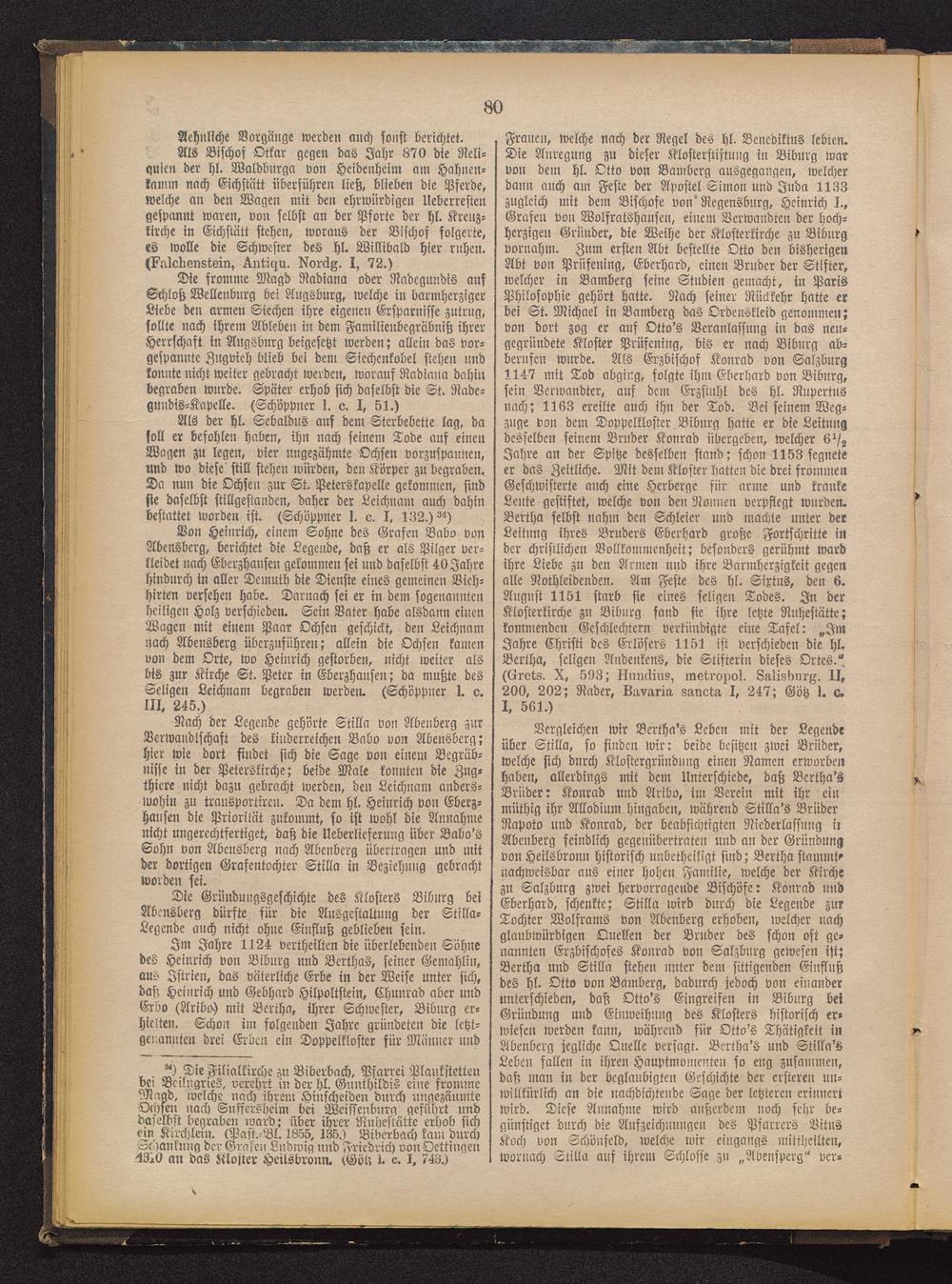 Vergleichen wir Bertha's Leben mit der Legendeüber Stilla, so finden wir: beide besitzen zwei Bruder,welche sich durch Klostergrnndnug einen Namen erworbenhaben, allerdings mit dem Unterschiede, daß Bertha'sBruder: Konrad und Aribo, im Verein mit ihr einmüthig ihr Allodium Hingaben, während Stilla's BruderRapoto und Konrad, der beabsichtigten Niederlassung iiAbenberg feindlich gegenübcrtraten und an der Gründungvon Heilsbronn historisch nnbetheiligt sind; Bcrtha stammtenachweisbar aus einer hohen Familie, welche der Kirchezu Salzburg zwei hervorragende Bischöfe: Konrad undEberhard, schenkte; Stilla wird durch die Legende zurTochter Wolframs von Abenberg erhoben, welcher nachglaubwürdigen Quellen der Bruder des schon oft ge-nannten Erzbischofes Konrad von Salzburg gewesen ist;Bertha und Stilla stehen unter dem sittigenden Einflußdes hl. Otto von Bamberg, dadurch jedoch von einanderunterschieden, daß Otto's Eingreifen in Bibnrg beiGründung und Einweihung des Klosters historisch er-wiesen werden kann, während für Otto's Thätigkeit inAbenberg jegliche Quelle versagt. Bertha's und Stilla'sLeben fallen in ihren Hauptmomenten so eng zusammen,daß man in der beglaubigten Geschichte der ersteren un-willkürlich an die nachdichtende Sage der letzteren erinnertwird. Diese Annahme wird außerdem noch sehr be-günstiget durch die Aufzeichnungen des Pfarrers LitnsKoch von Schönfcld, welche wir eingangs mittheilten,woruach Stilla auf ihrem Schlosse zu „Abenspcrg" vcr-