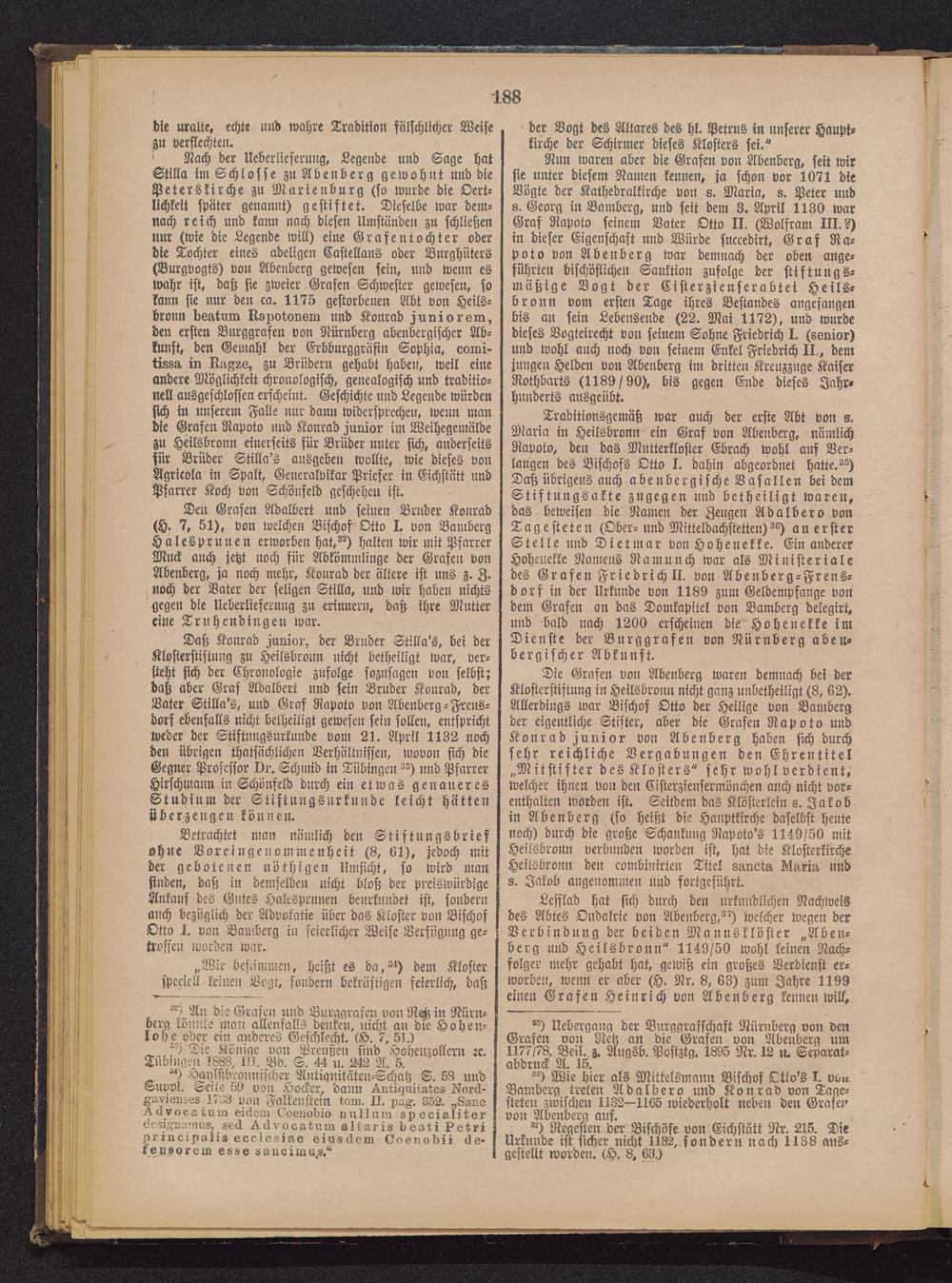 Nun waren aber die Grafen von Abenberg , seit wirsie unter diesem Namen kennen, ja schon vor 1071 dieVögte der Kathedralkirche von s. Maria, 8. Peter und8. Georg in Bamberg , und seit dem 3. April 1130 warGraf Rapoto seinem Vater Otto II. (Wolfram III.?)in dieser Eigenschaft und Würde snccedirt, Graf Na-poto von Abenberg war demnach der oben ange-führten bischöflichen Sanktion zufolge der stiftungs-mäßige Vogt der Cisterztenserabtei Heils-bronn vom ersten Tage ihres Bestandes angefangenbis an sein Lebensende (22. Mai 1172), und wurdedieses Vogteirecht von seinem Sohne Friedrich I. (senior)und wohl auch noch von seinem Enkel Friedrich II., demjungen Helden von Abenberg im dritten Kreuzznge KaiserRothbarts (1189/90), bis gegen Ende dieses Jahr-hunderts ausgeübt.