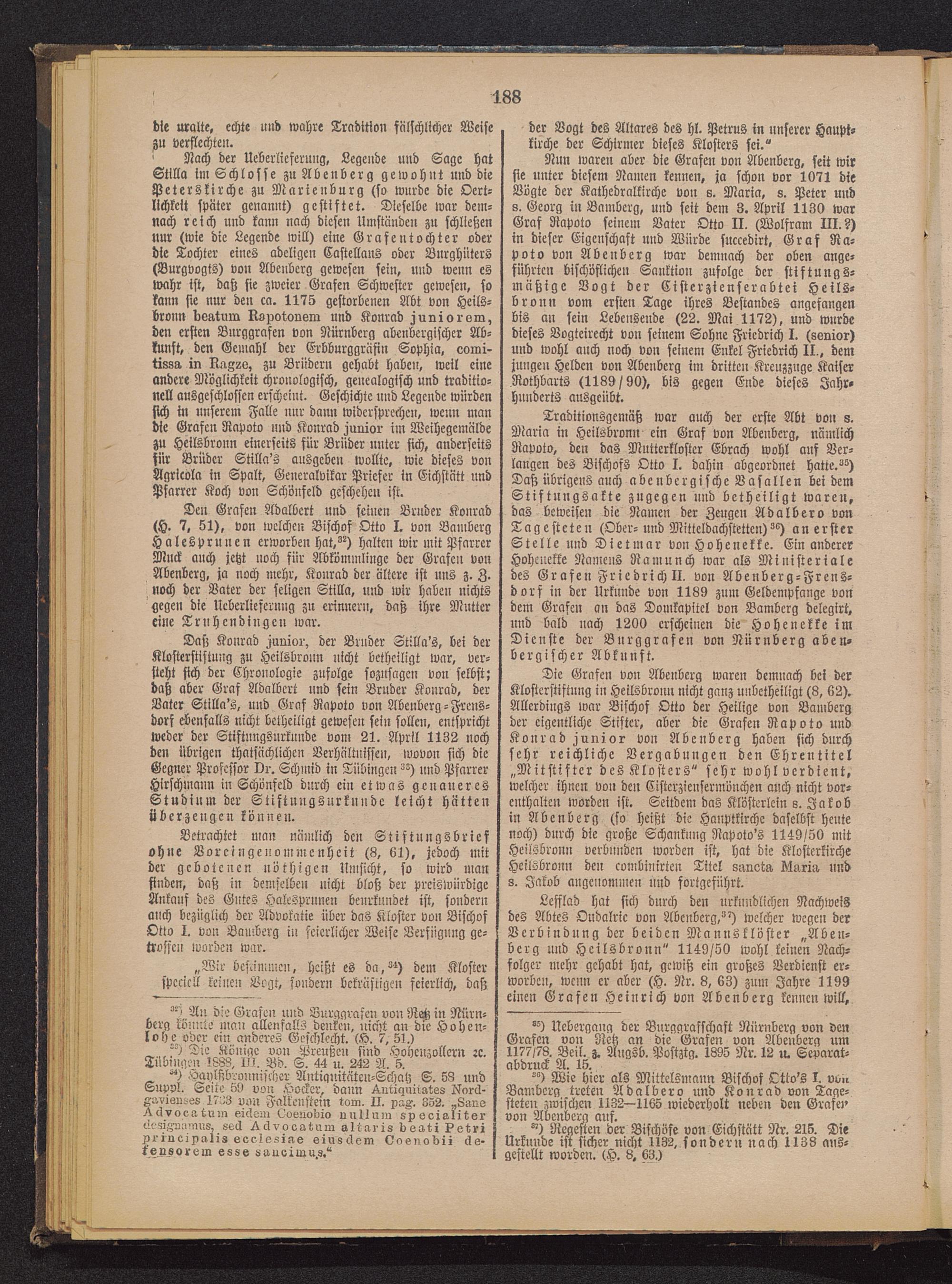 Das; Konrad .junior, der Bruder Stilla's, bei derKlosterstistnng zu Heilsbronn nicht betheiligt war, ver-sieht sich der Chronologie zufolge sozusagen von selbst;daß aber Graf Adalbert und sein Bruder Konrad, derVater Stilla's, und Graf Rapoto von Abenberg-Frens-dorf ebenfalls nicht betheiligt gewesen sein sollen, entsprichtweder der Stiftnngsnrknnde voni 21. April 1132 nochden übrigen thatsächlichen Verhältnissen, wovon sich dieGegner Professor vr. Schmid in Tübingen ^") und PfarrerHirschmann in Schönfcld durch ein etwas genaueresStudium der Stiftuugsnrkunde leicht hättenüberzeugen können.