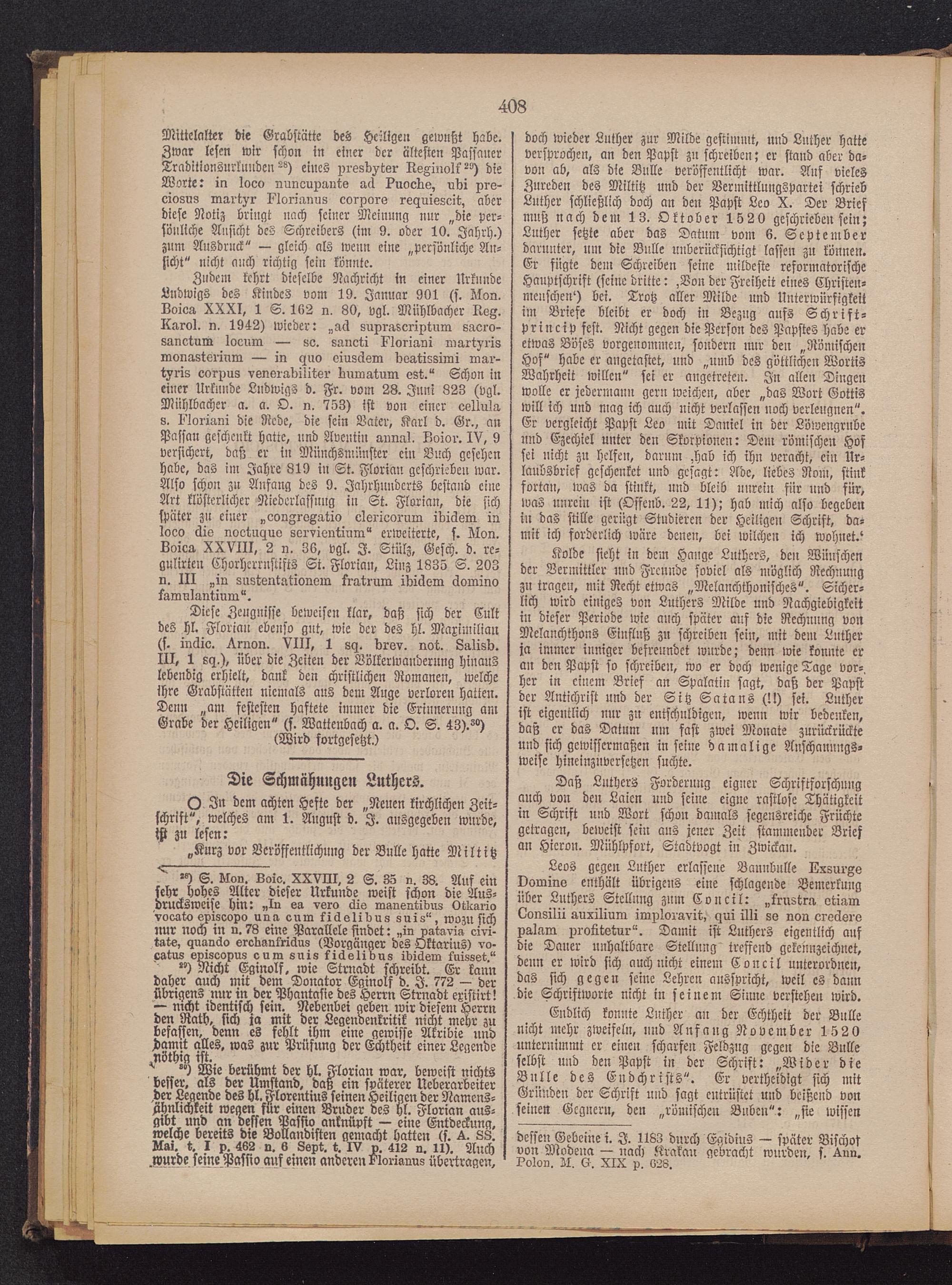 Endlich konnte Luther an der Echtheit der Bulle nicht mehr zweifeln, und Anfang November 1520unternimmt er einen scharfen Feldzng gegen die Bulle selbst und den Papst in der Schrift: „Wider dieBnlle des Endchrists". Er vertheidigt sich mitGründen der Schrift und sagt entrüstet und beißend vonseinen Gegnern, den „römischen Buben": „sie wissen
