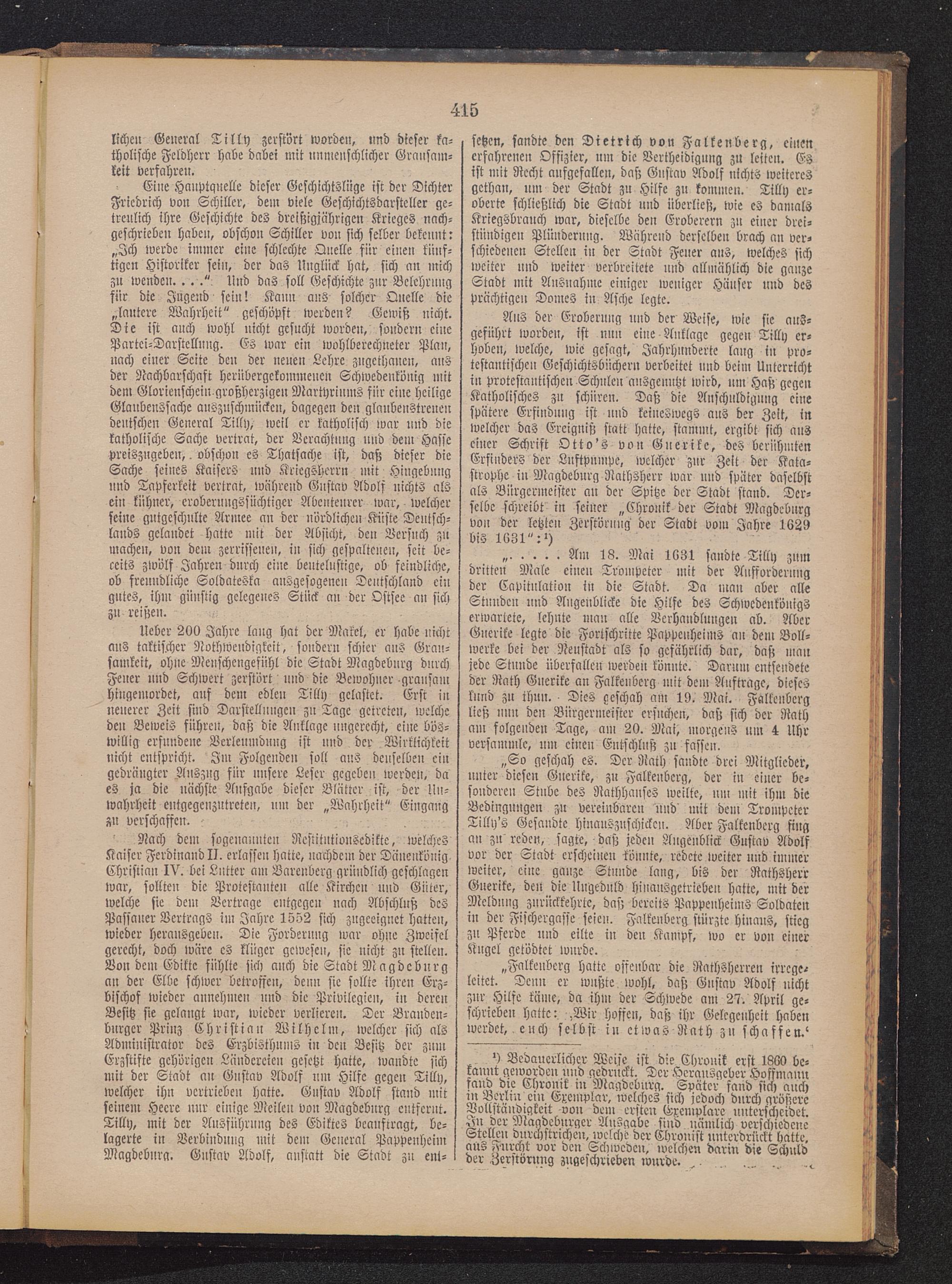Aus der Eroberung und der Weise, wie sie aus-geführt worden, ist nun eine Anklage gegen Tilly er-hoben, welche, wie gesagt, Jahrhunderte lang in pro-testantischen Geschichtsbüchern verbellet und beim Unterrichtin protestantischen Schulen ausgenutzt wird, um Haß gegenKatholisches zu schüren. Daß die Anschuldigung einespätere Erfindung ist und keineswegs aus der Zeit, inwelcher das Ereignis; statt hatte, stammt, ergibt sich auseiner Schrift Otto's von Gnerike, des berühmtenErfinders der Luftpumpe, welcher zur Zeit der Kata-strophe in Magdeburg Nathsherr war und später daselbstals Bürgermeister an der Spitze der Stadt stand. Der-selbe schreibt in seiner „Chronik der Stadt Magdeburg von der letzten Zerstörung der Stadt vom Jahre 1629bis 1631":')