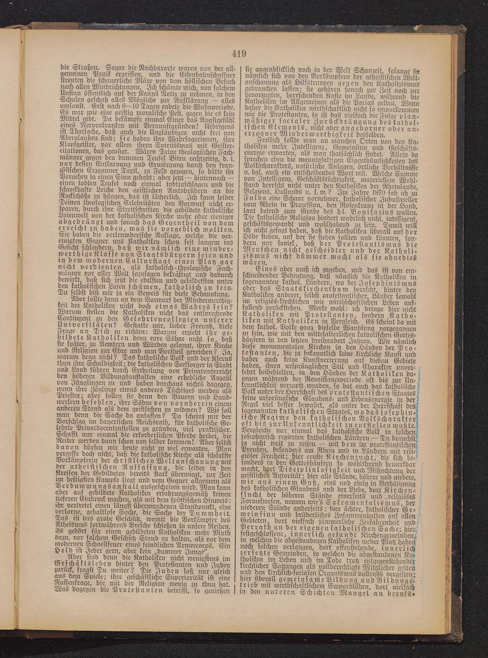 die Straßen. Sogar die Nachbarorte waren von der all-gemeinen Panik ergriffen, und die Eisenbcchnschaffnerstreuten die schauerliche Märe von dem höllischen Besuchnach allen Windrichtungen. Ich schämte mich, von solchemUnsinn öffentlich auf der Kanzel Notiz zu nehmen, in denSchulen geschah alles Mögliche zur Aufklärung — allesumsonst. Erst nach 8—10 Tagen endete die Wahnperiodc.Es war wie eine geistig moralische Pest, gegen die es keinMittel gibt. Da bekämpfe einmal Einer das Angstgefühleines Nervenkranken mit Vernunftgründen! Uebrigensist Thatsache , daß auch die Ungläubigen nicht frei vonAberglauben sind; sie haben ihre Wahrsagerinnen, ihreKlopfgeister, vor allem ihrer: Spiritismus mit Geister-citationen, das genügt. Wären Deine theologischer: Fach-männer gegen den dummer: Teufel Bitru rechtzeitig, d. i.vor dessen Entlarvung und Errvürgnng durch den fran-zösischer: Erzgauner Taxil, zu Feld gezogen, so hätte ihrVorgehen ja einer: Sinn gehabt; aber jetzt — hintcnnach —einer: todten Teufel noch einmal toötzuschlager: und dieschreckhafte Leiche den geistlicher: Arutsbrüderr: an dieRockschöße zu hängen, das ist lächerlich. Ich kam: leiderDeinen theologischen Cclcbritäter: den Vorwurf nicht er-sparen, durch ihre Streitschriften die gebildete katholischeLaienwelt vor: der katholischen Kirche mehr oder wenigerabgedrängt und sonach das Gegentheil von demerreicht zu haben, was sie vorgeblich wollten.Sie Haber: die verleumderische Anklage, welche die ver-einigten Gegner uns Katholikei: schon seit langem insGesicht schleudern, daß wir nämlich eine minder-werthrge Klasse von Staatsbürgern seien undin dem modernen Cultur-staat e:ncn Platz gar-nicht verdienten, als katholisch-theologische Fach-männer vor aller Welt sozusagen bekräftigt und dadurchbewirkt, daß sich jetzt die edelsten und gebildetster: unterdcn katholischen Laien schämen, katholisch zu sein.Du selbst bist mir ja ein Beweis für diese Behauptung.