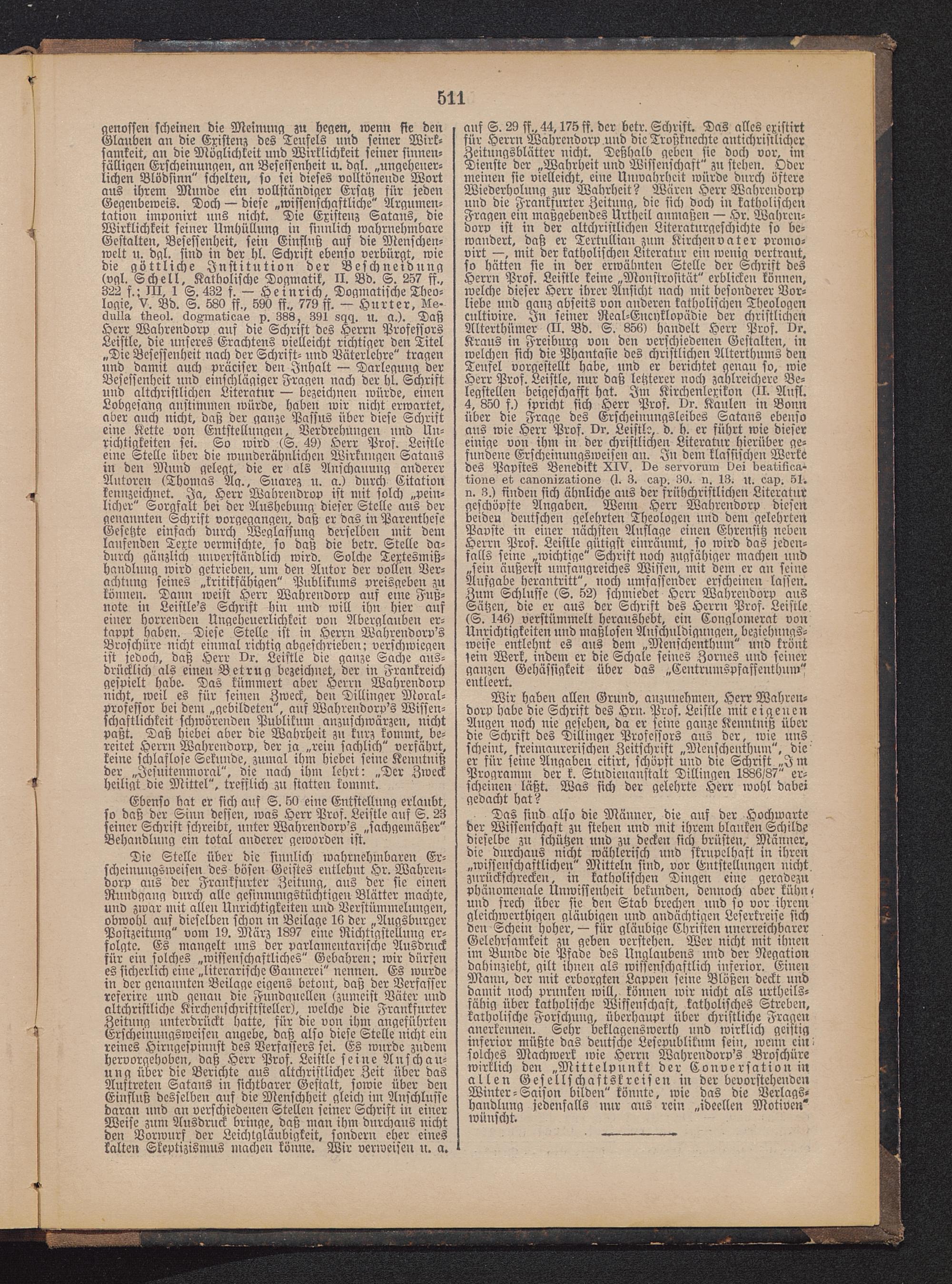 auf S. 29 ff.,44,175 ff. der bctr. Schrift. Das alles existirtfür Herrn Wahrendorp und die Troßknechte antichristlichcrZeitungsblätter nicht. Deßhalb geben sie doch vor, imDienste der „Wahrheit und Wissenschaft" zu stehen. Odermeinen sie vielleicht, eine Unwahrheit würde durch öftereWiederholung zur Wahrheit? Wären Herr Wahrendorpund die Frankfurter Zeitung, die sich doch in katholischenFragen ein maßgebendes Urtheil anmaßen — Hr. Wahren-dorp ist in der altchristlichen Literaturgeschichte so be-wandert, daß er Tcrtullian zum Kirchenvater promo-virt —, mit der katholischen Literatur ein wenig vertraut,so hätten sie in der erwähnten Stelle der Schrift desHerrn Pros. Leistle keine „Monstrosität" erblicken können,welche dieser Herr ihrer Ansicht nach mit besonderer Vor-liebe und ganz abseits von anderen katholischen Theologencultivire. In seiner Real-Encyklopädie der christlichenAlterthümer (II. Bd. S. 856) handelt Herr Pros. Dr.Kraus in Freiburg von den verschiedenen Gestalten, inwelchen sich die Phantasie des christlichen Alterthums denTeufel vorgestellt habe, und er berichtet genau so, wieHerr Pros. Leistle, nur daß letzterer noch zahlreichere Be-legstellen beigeschafft hat. Im Kirchenlexikon (II. Ausl.4, 850 f.) spricht sich Herr Pros. Dr. Kaulen in Bonn über die Frage des Erscheinungsleibes Satans ebensoaus wie Herr Pros. Dr. Leistle, d. h. er führt wie diesereinige von ihm in der christlichen Literatur hierüber ge-fundene Erscheinungsweisen an. In dem klassischen Werkedes Papstes Benedikt XIV. Os ssrvornm Osi beatiüoa-tions st eanonirationS (I. 3. eap. 30. u. 13. n. oap. öl.u. 3.) finden sich ähnliche aus der frühchristlichen Literaturgeschöpfte Angaben. Wenn Herr Wahrendorp diesenbeide» deutschen gelehrten Theologen und dem gelehrtenPapste in einer nächsten Auflage einen Ehrensitz nebenHerrn Pros. Leistle gütigst einräumt, so wird das jeden-falls seine „wichtige" Schrift noch zugfähiger machen und„sein äußerst umfangreiches Wissen, mit dem er au seineAufgabe herantritt", noch umfassender erscheinen lassen.Zum Schlüsse (S. 52) schmiedet Herr Wahrendorp ausSätzen, die er aus der Schrift des Herrn Pros. Leistle(S. 146) verstümmelt heraushebt, ein Conglomerat vonUnrichtigkeiten und maßlosen Anschuldigungen, beziehungs-weise entlehnt es aus dem „Menschenthum" und krönt(ein Werk, indem er die Schale seines Zornes und seinerganzen Gehässigkeit über das „Centrumspfaffenthum"entleert.