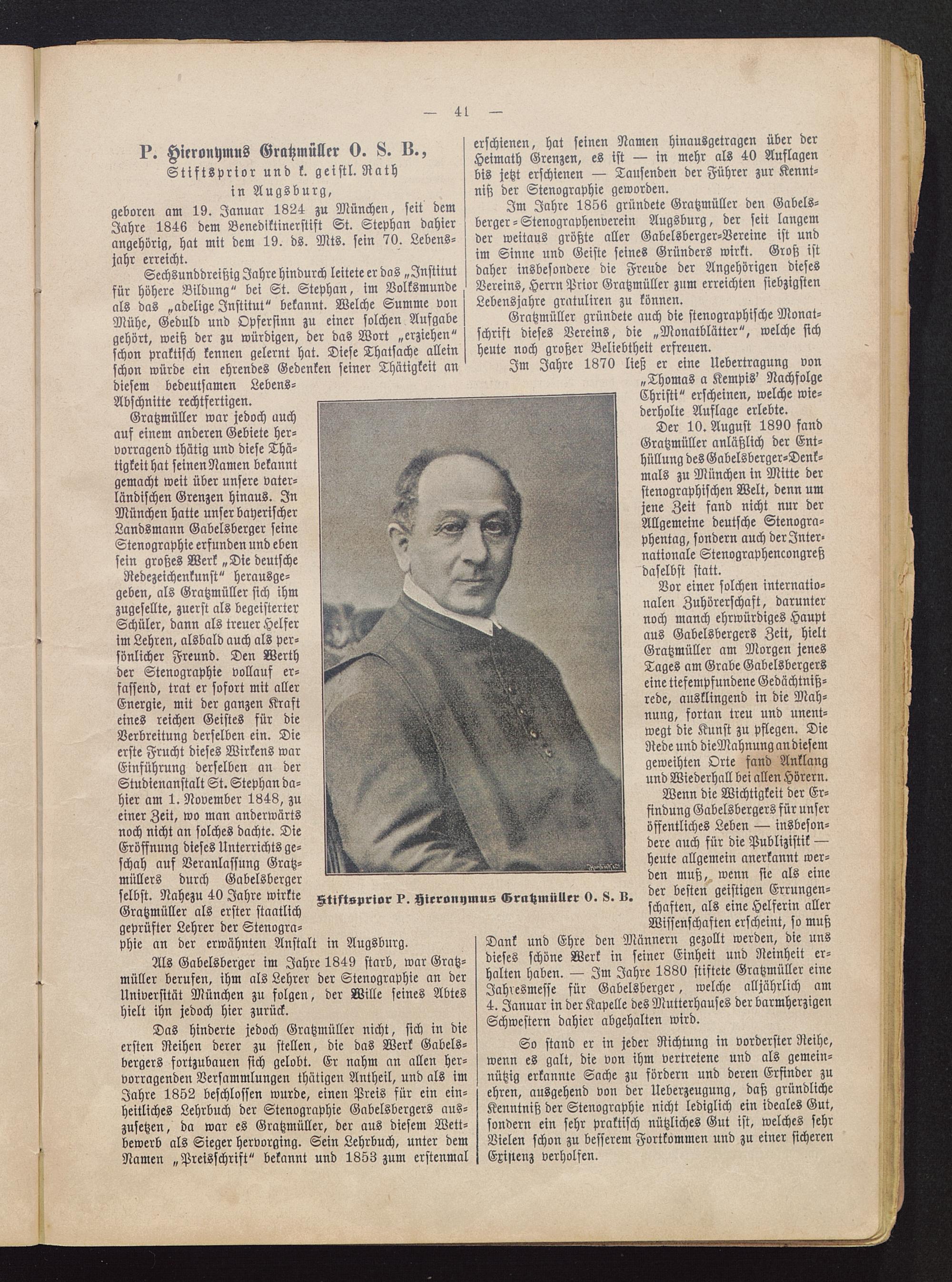 Im Jahre 1856 gründete Gratzmüller den Gabels-berger - Stenographenverein Augsburg, der seit langemder weitaus größte aller Gabelsberger-Vereine ist undim Sinne und Geiste seines Gründers wirkt. Groß istdaher insbesondere die Freude der Angehörigen diesesVereins, Herrn Prior Gratzmüller zum erreichten siebzigstenLebensjahre gratuliren zu können.