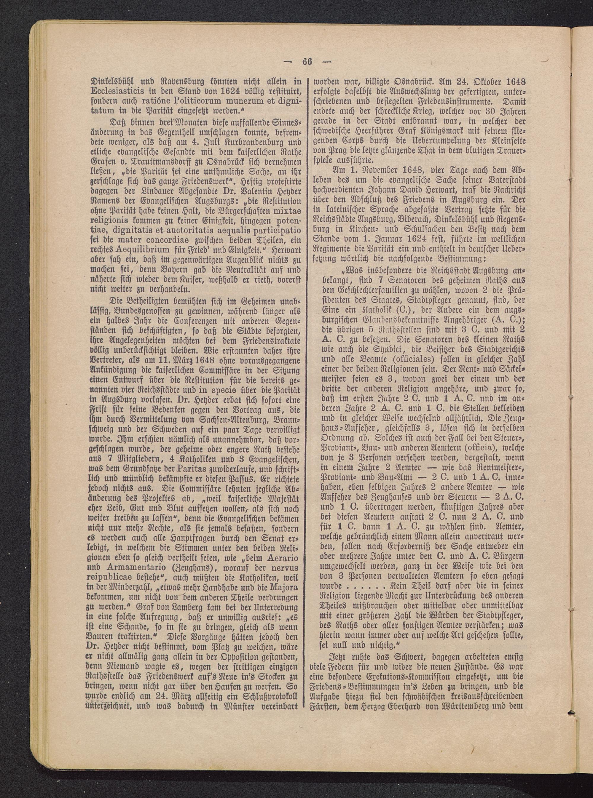 Am 1. November 1648, vier Tage nach dem Ab-leben des um die evangelische Sache seiner Vaterstadthochverdienten Johann David Herwart, traf die Nachrichtüber den Abschluß des Friedens in Augsburg ein. Derin lateinischer Sprache abgefaßte Vertrag setzte für dieReichsstädte Augsburg, Biberach, Dinkelsbühl und Regens-burg in Kirchen- und Schulsachen den Besitz nach demStande vom 1. Januar 1624 fest, führte im weltlichenRegiments die Parität ein und enthielt in deutscher Ueber-sctznng wörtlich die nachfolgende Bestimmung: