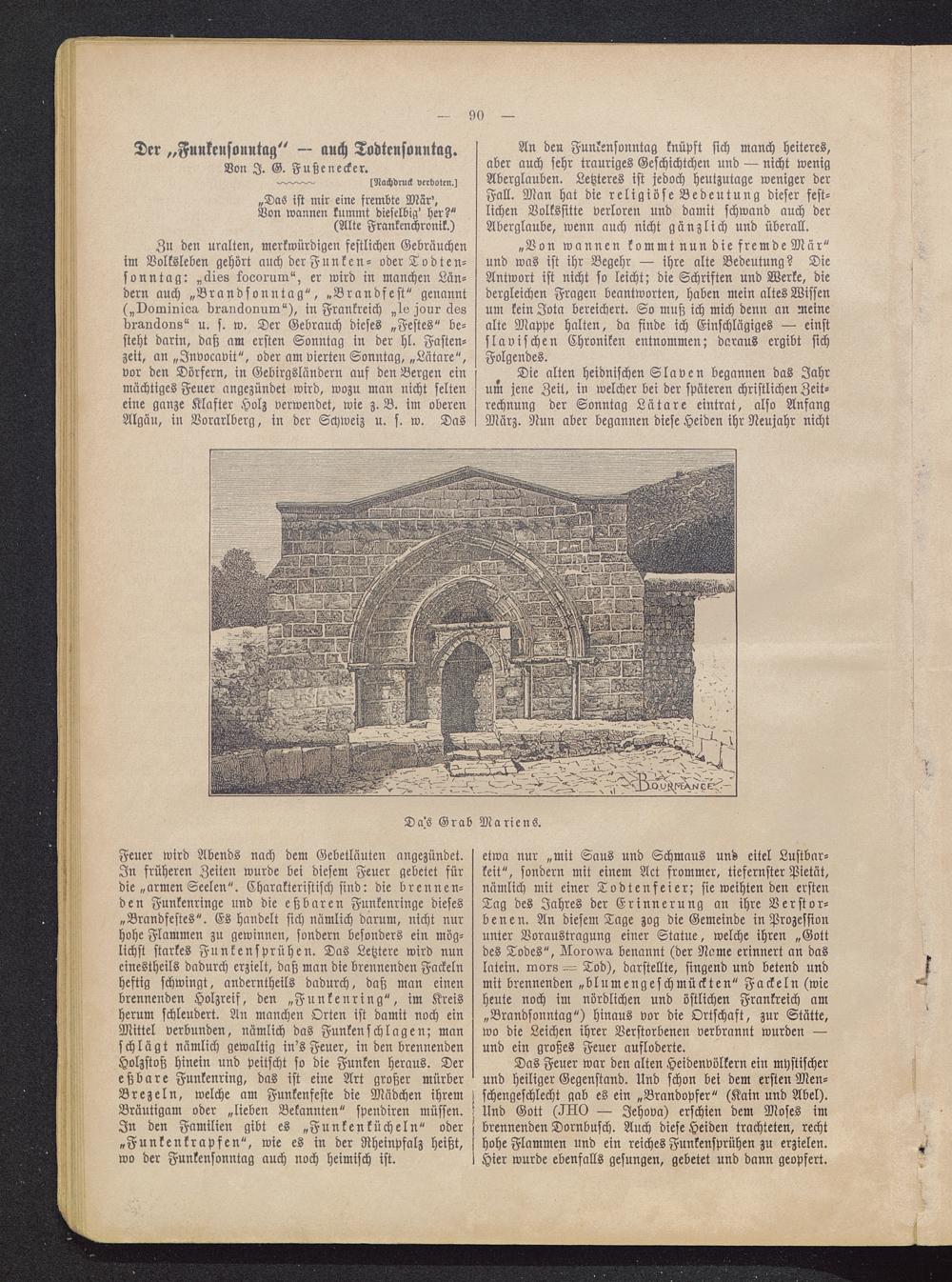 Zu den uralten, merkwürdigen festlichen Gebräuchenim Volksleben gehört auch der Funken- oderTodten-sonntag: „äis8 ckoeorura", er wird in manchen Län-dern auch „Brandsonntag", „Brandfest" genannt(„Oonaiinsa. brrrnckonuin"), in Frankreich „ 1s jour cls8brLnäon8" u. s. w. Der Gebrauch dieses „Festes" be-steht darin, daß am ersten Sonntag in der hl. Fasten-zeit, an „Jnvocavit", oder am vierten Sonntag, „Lätare",vor den Dörfern, in Gebirgslündern auf den Bergen einmächtiges Feuer angezündet wird, wozu man nicht selteneine ganze Klafter Holz verwendet, wie z. B. im oberenAlgäu, in Vorarlberg, in der Schweiz u. s. w. Das