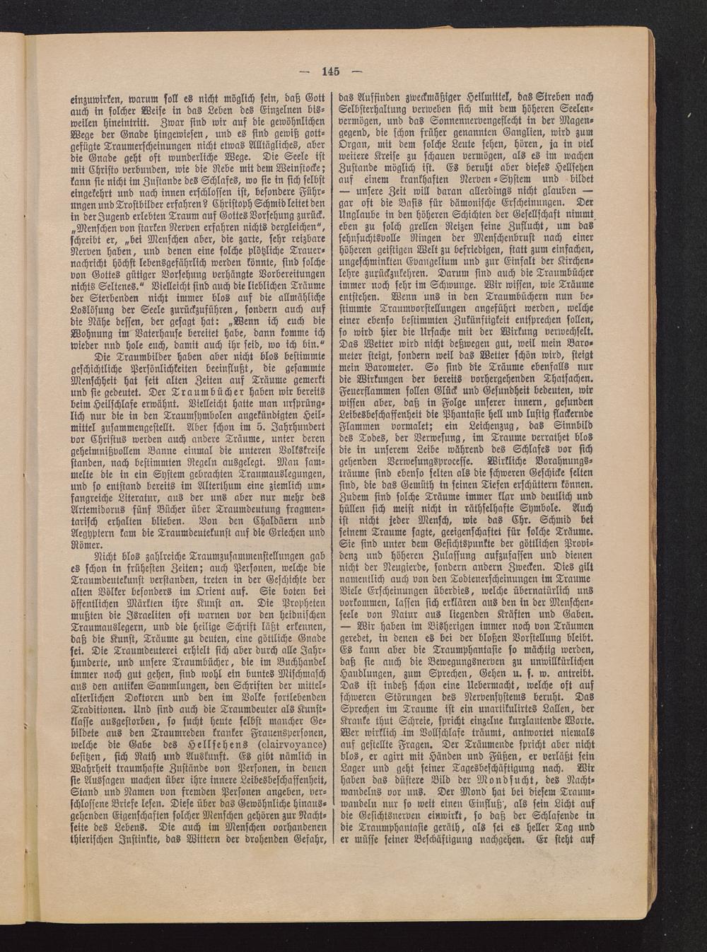 — unsere Zeit will daran allerdings nicht glauben —gar oft die Basis für dämonische Erscheinungen. DerUnglaube in den höheren Schichten der Gesellschaft nimmteben zu solch grellen Reizen seine Zuflucht, um dassehnsuchtsvolle Ringen der Menschenbrust nach einerhöheren geistigen Welt zu befriedigen, statt zum einfachen,ungeschminkten Evangelium und zur Einfalt der Kirchcn-lehre zurückzukehren. Darum sind auch die Traumbücherimmer noch sehr im Schwünge. Wir wissen, wie Träumeentstehen. Wenn uns in den Traumbüchern nun be-stimmte Traumvorstellungen angeführt werden, welcheeiner ebenso bestimmten Zukünftigkeit entsprechen sollen,so wird hier die Ursache mit der Wirkung verwechselt.Das Wetter wird nicht deßwegen gut, weil mein Baro-meter steigt, sondern weil das Wetter schön wird, steigtmein Barometer. So sind die Träume ebenfalls nurdie Wirkungen der bereits vorhergehenden Thatsachen.Feuerflammen sollen Glück und Gesundheit bedeuten, wirwissen aber, daß in Folge unserer innern, gesundenLeibesbeschaffenheit die Phantasie hell und lustig flackerndeFlammen vormalet; ein Leichenzug, das Sinnbilddes Todes, der Verwesung, im Traume verrathet blosdie in unserem Leibe während des Schlafes vor sichgehenden Verwesungsprocesse. Wirkliche Vorahnungs-träume sind ebenso selten als die schweren Geschicke seltensind, die das Gemüth in seinen Tiefen erschüttern können.Zudem sind solche Träume immer klar und deutlich undhüllen sich meist nicht in räthselhafte Symbole. Auchist nicht jeder Mensch, wie das Chr. Schmid beiseinem Traume sagte, geeigenschaftet für solche Träume.Sie sind unter dem Gesichtspunkte der göttlichen Provi-denz und höheren Zulassung aufzufassen und dienennicht der Neugierde, sondern andern Zwecken. Dies giltnamentlich auch von den Todtenerscheinungen im TraumeViele Erscheinungen überdies, welche übernatürlich unsvorkommen, lassen sich erklären aus den in der Menschen-seele von Natur aus liegenden Kräften und Gaben.