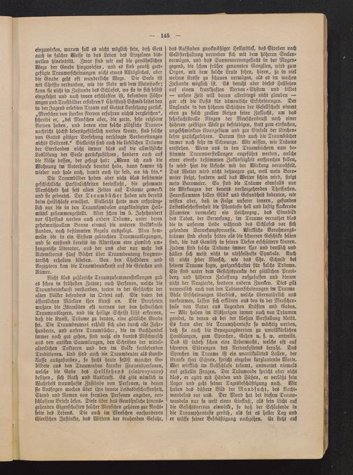 Nicht blos zahlreiche Traumzusammenstellungen gabes schon in frühesten Zeiten; auch Personen, welche dieTraumdeutekunst verstanden, treten in der Geschichte deralten Völker besonders im Orient auf. Sie boten beiöffentlichen Märkten ihre Kunst an. Die Prophetenmußten die Jsraeliten oft warnen vor den heidnischenTraumauslegern, und die heilige Schrift läßt erkennen,daß die Kunst, Träume zu deuten, eine göttliche Gnadefei. Die Traumdeuterei erhielt sich aber durch alle Jahr-hunderte, und unsere Traumbücher, die im Buchhandelimmer noch gut gehen, sind wohl ein buntes Mischmaschaus den antiken Sammlungen, den Schriften der mittel-alterlichen Doktoren und den im Volke fortlebendenTraditionen. Und sind auch die Traumdeuter als Kunst-klasse ausgestorben, so sucht heute selbst mancher Ge-bildete aus den Traumreden kranker Frauenspersonen,welche die Gabe des Hellsehens (olairvoxnnes)besitzen, sich Rath und Auskunft. ES gibt nämlich inWahrheit traumhafte Zustände von Personen, in denensie Aussagen machen über ihre innere Leibesbeschaffenheit,Stand und Namen von fremden Personen angeben, ver-schlossene Briefe lesen. Diese über das Gewöhnliche hinaus-gehenden Eigenschaften solcher Menschen gehören zur Nacht-seite des Lebens. Die auch im Menschen vorhandenenthierischen Instinkte, das Wittern der drohenden Gefahr,
