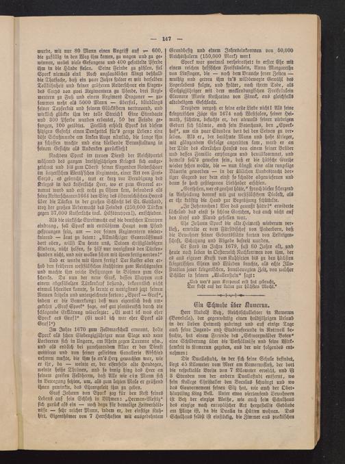 Nachdem Spork im treuen Dienst der Neichsparteiwährend des ganzen dreißigjährigen Krieges sich ausge-zeichnet und bis zum Oberst seiner fliegenden Neiterschaarim bayerischen Werth'schen Negimente, einer Art von Frei-Corps, es gebracht, trat er kurz vor Beendigung desKrieges in das kaiserliche Heer, wo er zum General er-nannt ward und erst recht zu Ehren kam, besonders alsseine Neiterschaaren1664 den Sieg des österreichischen Heeresüber die Türken in der großen Schlacht bei St. Eotthard,trotz der großen Uebermacht des Feindes (250,000 Türkengegen 37,000 Kaiserliche iucl. Hilfstruppen!), entschieden.