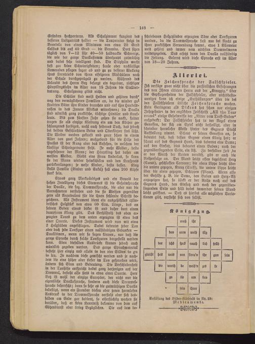 Etwas ganz Merkwürdiges und ein Beweis derhohen Intelligenz dieses Stammes ist die Geheimspracheder Dualla, die sog. Trommelsprache, die aber nur dieVornehmeren verstehen und die sie Weißen gegenübergern als Aequivalent für die ihnen fehlende Schrift be-zeichnen. Als Instrument dient ein ausgehöhltes cylin-drisches Holzstück von etwa 60 Ctm. Länge, das anseinem Boden etwas dicker ist und daher dort einendumpferen Klang gibt. Das Verhältniß des oben er-zeugten Tones zu dem unten erzeugten ist etwa daseiner Quarte. Dieses Instrument wird nun mit etwa2 Holzstäben angeschlagen. Dabei bedeutet jeder Tonoder doch jede Tonfigur einen vollständigen Gedanken —Duallismen, wenn wir so sagen können, nur daß dieganze Sprache durch solche Tonfiguren dargestellt werdenkann. Eben dieselben Ausdrücke können jedoch auchMündlich gegeben werden. Das ganze Sprachmaterialbesteht hier einzig und allein in den vier Silben to Zuio ku. Je nachdem diese gemischt werden und je nach-dem die eine höher oder tiefer im Ton gesprochen wird,ändern sich Sinn und Bedeutung. Die Verschiedenheitin der Tonhöhe entspricht dabei ganz derjenigen auf derTrommel, besteht also stets in etwa einer Quarte. HerrVetz ist wohl der einzige Europäer, der nicht nur dieeigentliche Duallasprache, sondern auch diese Trommel-sprache beherrscht; denn so sehr es die gutmüthigen Duallabelustigt, wenn ein Fremder diesen oder jenen harmlosenAusdruck in der Trommelsprache versteht oder sich des-selben am Ende gar bedient, so eifersüchtig wachen siedarüber, daß er keine Kenntniß bekomme von dem aufGötzendienst oder Krieg Bezüglichen. Die auf dem be-
