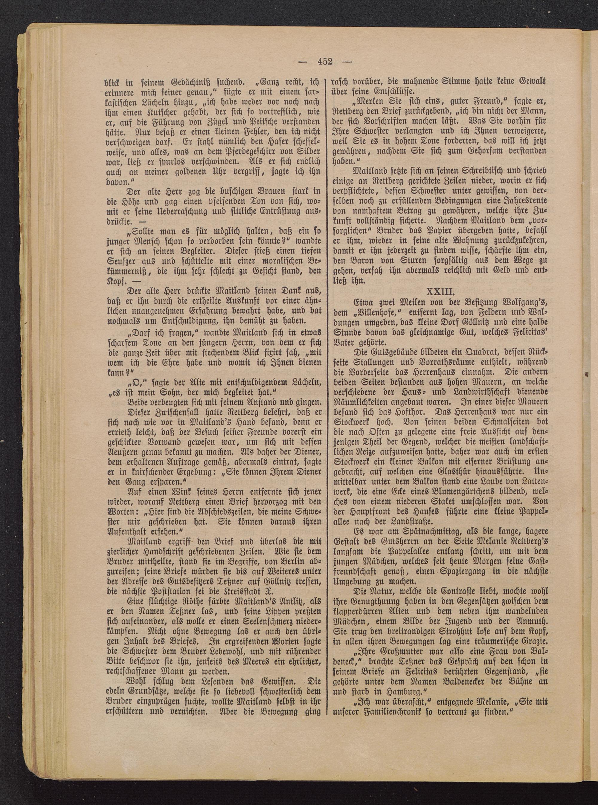 Es war am Spätnachmittag, als die lange, hagereGestalt des Gutsherrn an der Seite Melanie Rettberg'slangsam die Pappelallee entlang schritt, um mit demjungen Mädchen, welches seit heute Morgen seine Gast-freundschaft genoß, einen Spaziergang in die nächsteUmgebung zu machen.
