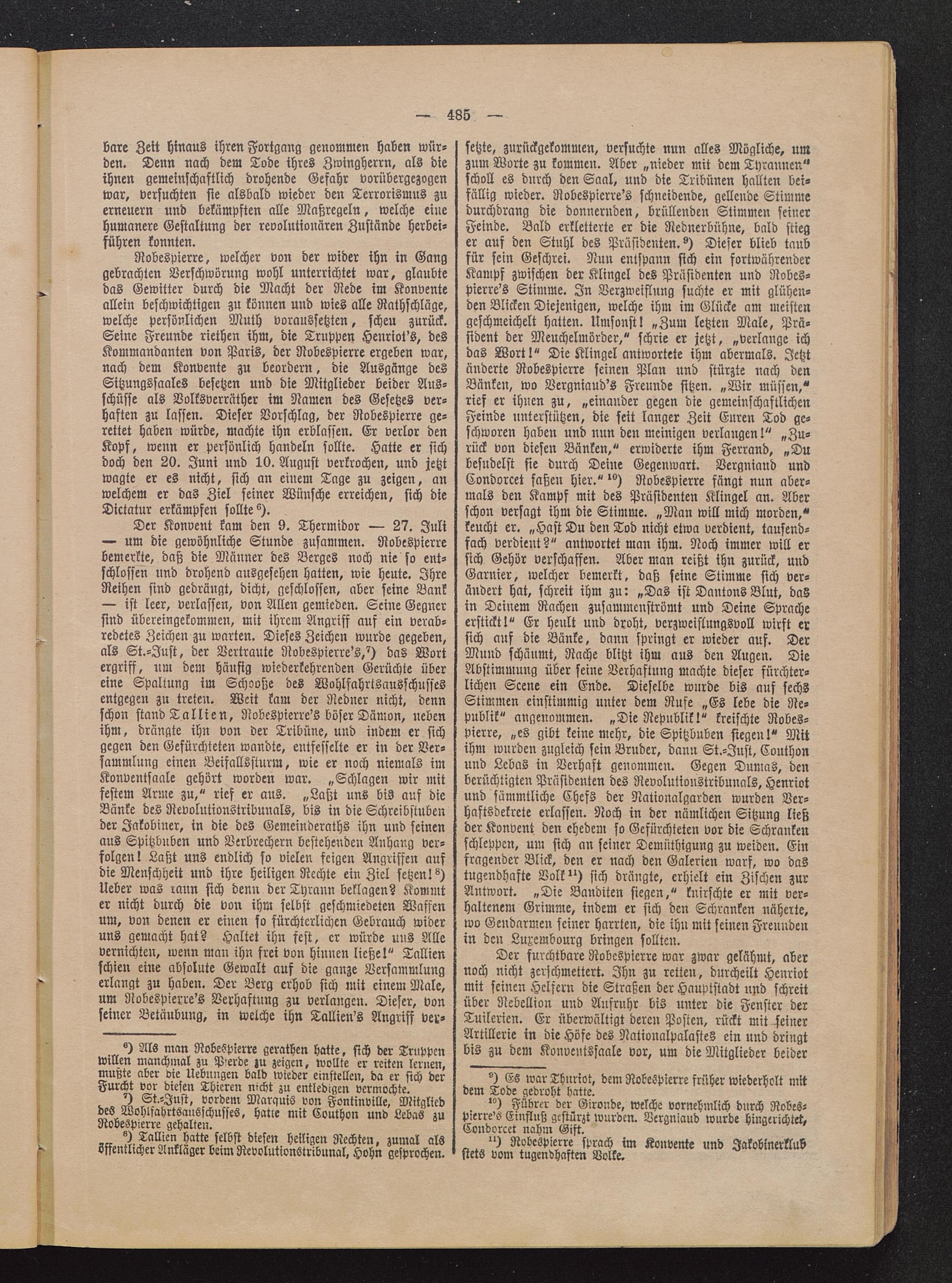 setzte, zurückgekommen, versuchte nun alles Mögliche, umzum Worte zu kommen. Aber „nieder mit dem Tyrannen"scholl es durch den Saal, und die Tribünen hallten bei-fällig wieder. Nobespierre's schneidende, gellende Stimmedurchdrang die donnernden, brüllenden Stimmen seinerFeinde. Bald erkletterte er die Neduerbühne, bald stieger auf den Stuhl des Präsidenten.^) Dieser blieb taubfür sein Geschrei. Nun entspann sich ein fortwährenderKampf zwischen der Klingel des Präsidenten und Nobes-pierre's Stimme. In Verzweiflung suchte er mit glühen-den Blicken Diejenigen, welche ihm im Glücke am meistengeschmeichelt hatten. Umsonst! „Zum letzten Male, Prä-sident der Meuchelmörder," schrie er jetzt, „verlange ichdas Wort!" Die Klingel antwortete ihm abermals. Jetztänderte Nobespierre seinen Plan und stürzte nach denBänken, wo Vergniaud's Freunde sitzen. „Wir müssen,"rief er ihnen zu, „einander gegen die gemeinschaftlichenFeinde unterstützen, die seit langer Zeit Euren Tod ge-schworen haben und nun den meinigen verlangen!" „Zu-rück von diesen Bänken," erwiderte ihm Ferrand, „Dubesudelst sie durch Deine Gegenwart. Vergniand undCondorcet saßen hier." ") Nobespierre fängt nun aber-mals den Kampf mit des Präsidenten Klingel an. Aberschon versagt ihm die Stimme. „Man will mich morden,"keucht er. „Hast Du den Tod nicht etwa verdient, tausend-fach verdient?" antwortet man ihm. Noch immer will ersich Gehör verschaffen. Aber man reißt ihn zurück, undGarnier, welcher bemerkt, daß seine Stimme sich ver-ändert hat, schreit ihm zu: „Das ist Dantons Blut, dasin Deinem Rachen zusammenströmt und Deine Spracheerstickt!" Er heult und droht, vcrzweiflungsvoll wirft ersich auf die Bänke, dann springt er wieder auf. DerMund schäumt, Rache blitzt ihm aus den Augen. DieAbstimmung über seine Verhaftung machte dieser fürchter-lichen Scene ein Ende. Dieselbe wurde bis auf sechsStimmen einstimmig unter dem Rufe „Es lebe die Re-publik" angenommen. „Die Republik!" kreischte Robes-pierre , „es gibt keine mehr, die Spitzbuben siegen!" Mitihm wurden zugleich sein Bruder, dann St.-Just, Couthon und Lebas in Verhaft genommen. Gegen Dumas, denberüchtigten Präsidenten des Nevolutionstribunals, Henriotund sämmtliche Chefs der Nationalgarden wurden Ver-haftsdekrete erlassen. Noch in der nämlichen Sitzung ließder Konvent den ehedem so Gefürchteten vor die Schrankenschleppen, um sich an seiner Demüthigung zu weiden. Einfragender Blick, den er nach den Galerien warf, wo dastugendhafte Volk") sich drängte, erhielt ein Zischen zurAntwort. „Die Banditen siegen," knirschte er mit ver-haltenem Grimme, indem er sich den Schranken näherte,wo Gendarmen seiner harrten, die ihn mit feinen Freundenin den Luxembourg bringen sollten.