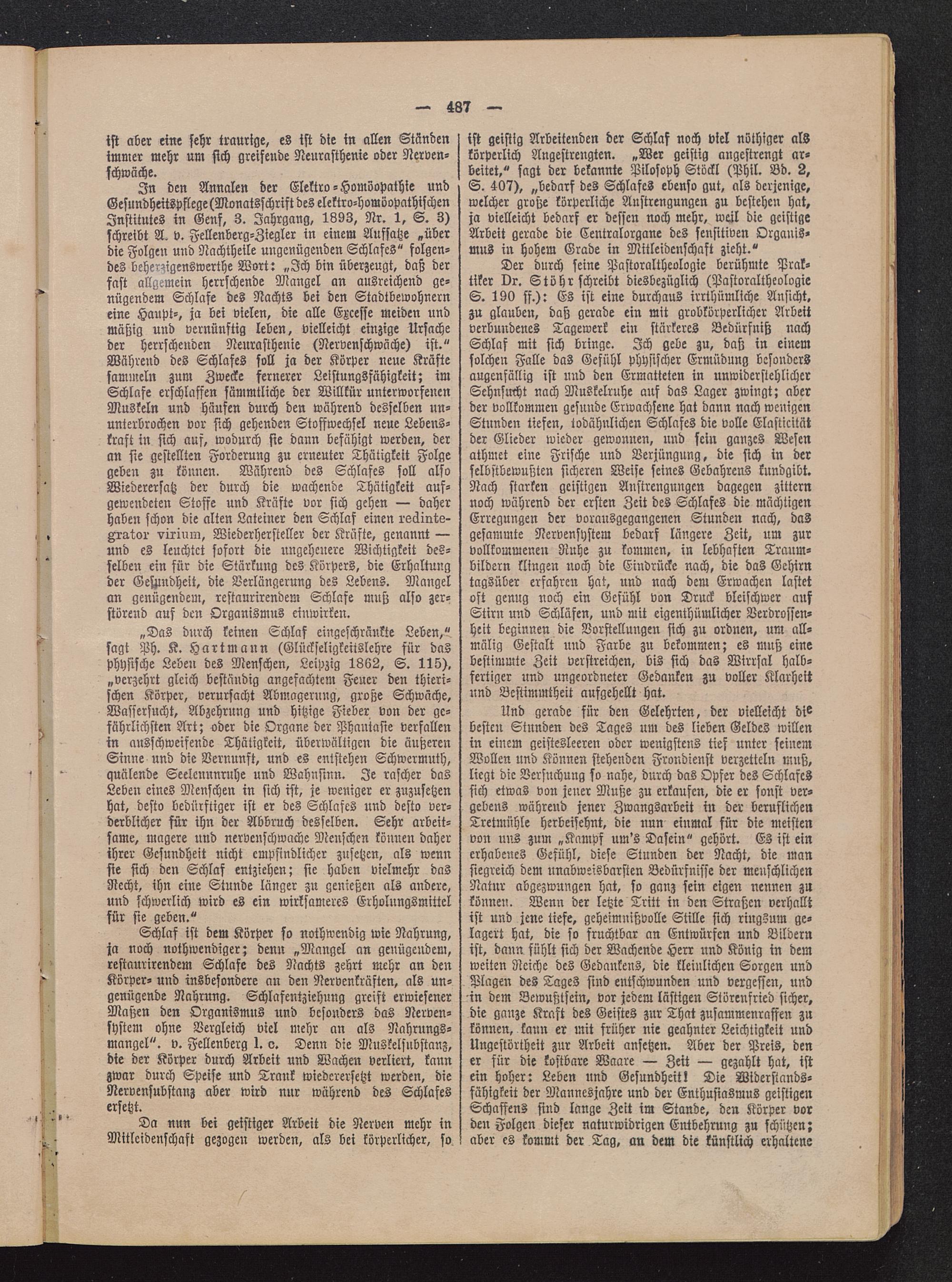 In den Annalen der Elektro - Homöopathie undGesundheitspflege (Monatsschrift des elektro-homöopathtschenInstitutes in Genf , 3. Jahrgang, 1893, Nr. 1, S. 3)schreibt A. v. Fellenberg-Ziegler in einem Aufsätze „überdie Folgen und Nachtheile ungenügenden Schlafes" folgen-des beherzigenswerthe Wort: „Ich bin überzeugt, daß derfast allgemein herrschende Mangel an ausreichend ge-nügendem Schlafe des Nachts bei den Stadtbewohnerneine Haupt-, ja bei vielen, die alle Excesse meiden undmäßig und vernünftig leben, vielleicht einzige Ursacheder herrschenden Neurasthenie (Nervenschwäche) ist."Während des Schlafes soll ja der Körper neue Kräftesammeln zum Zwecke fernerer Leistungsfähigkeit; imSchlafe erschlaffen sämmtliche der Willkür unterworfenenMuskeln und häufen durch den während desselben un-unterbrochen vor sich gehenden Stoffwechsel neue Lebens-kraft in sich auf, wodurch sie dann befähigt werden, deran sie gestellten Forderung zu erneuter Thätigkeit Folgegeben zu können. Während des Schlafes soll alsoWiederersatz der durch die wachende Thätigkeit auf-gewendeten Stoffe und Kräfte vor sich gehen — daherhaben schon die alten Lateiner den Schlaf einen reäiuta-Zrator viiiam, Wiederhersteller der Kräfte, genannt —und es leuchtet sofort die ungeheuere Wichtigkeit des-selben ein für die Stärkung des Körpers, die Erhaltungder Gesundheit, die Verlängerung des Lebens. Mangelan genügendem, restaurirendem Schlafe muß also zer-störend auf den Organismus einwirken.