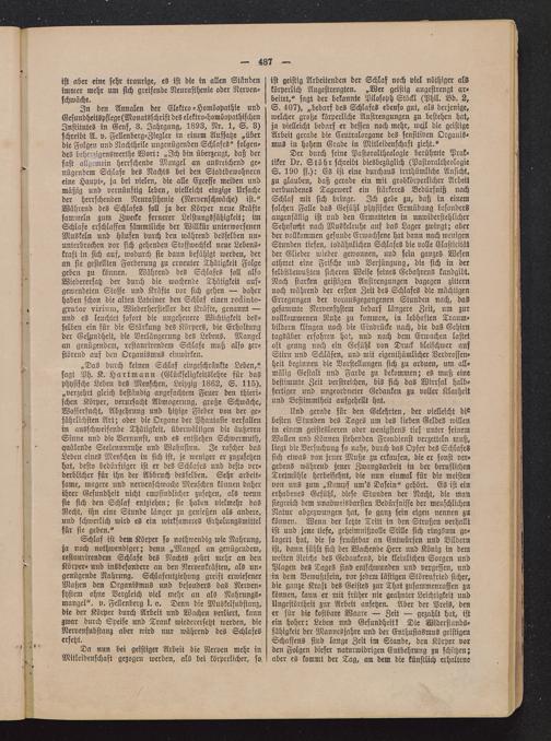 „Das durch keinen Schlaf eingeschränkte Leben,"sagt Ph. K. Hartmann (Glückseligkeiislehre für dasphysische Leben des Menschen, Leipzig 1862, S. 115),„verzehrt gleich beständig angefachtem Feuer den thieri-schen Körper, verursacht Abmagernng, große Schwäche,Wassersucht, Abzehrung und hitzige Fieber von der ge-fährlichsten Art; oder die Organe der Phantasie verfallenin ausschweifende Thätigkeit, überwältigen die äußerenSinne und die Vernunft, und es entstehen Schwermuth,quälende Seelennnruhe und Wahnsinn. Je rascher dasLeben eines Menschen in sich ist, je weniger er zuzusetzenhat, desto bedürftiger ist er des Schlafes und desto ver-derblicher für ihn der Abbruch desselben. Sehr arbeit-same, magere und nervenschwache Menschen können daherihrer Gesundheit nicht empfindlicher zusetzen, als wennsie sich den Schlaf entziehen; sie haben vielmehr dasRecht, ihn eine Stunde länger zu genießen als andere,und schwerlich wird es ein wirksameres Erholungsmittelfür sie geben."