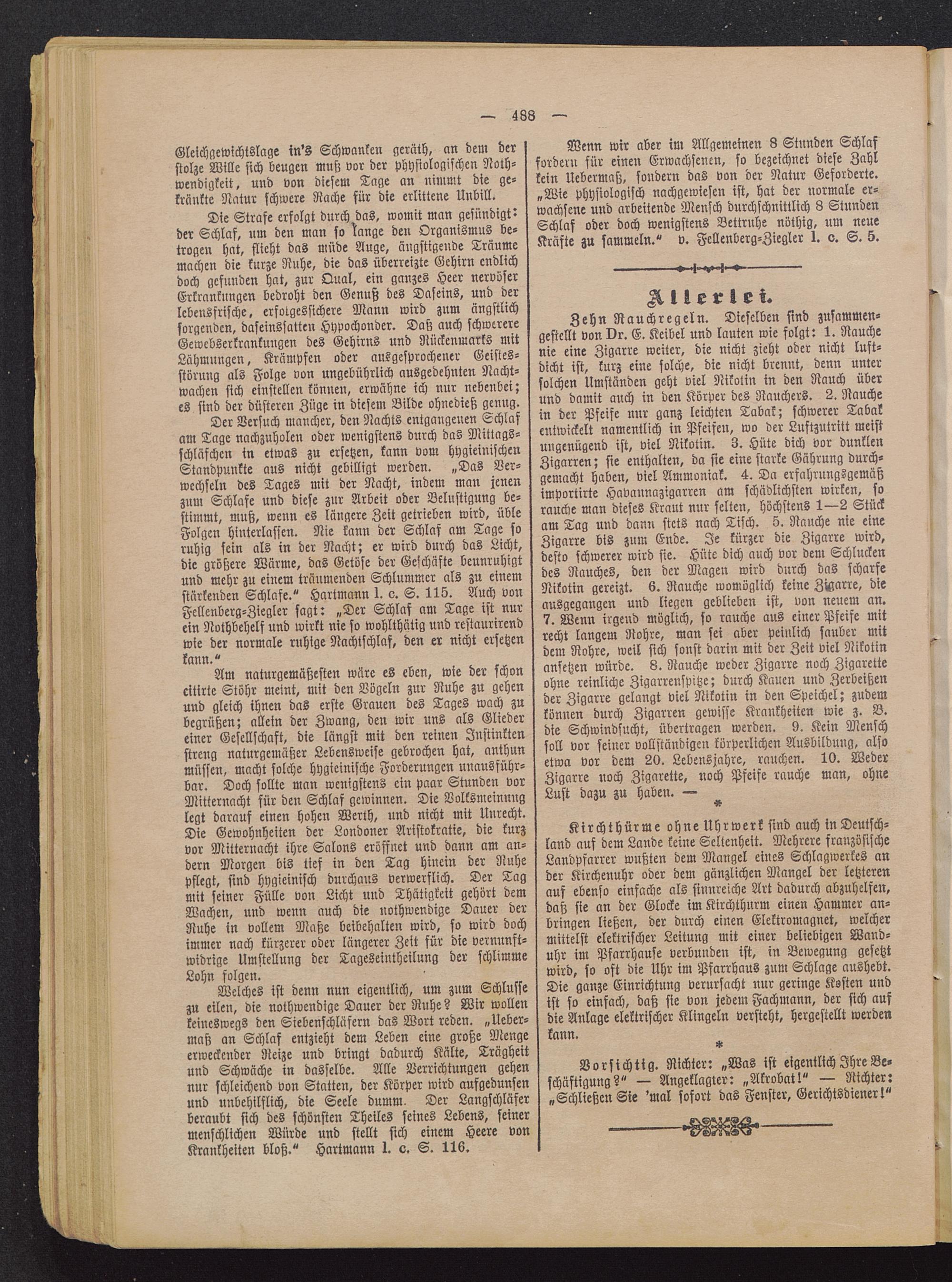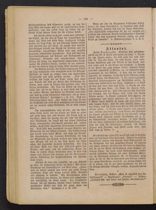 Am naturgemäßesten wäre es eben, wie der schoncitirte Stöhr meint, mit den Vögeln zur Ruhe zu gehenund gleich ihnen das erste Grauen des Tages wach zubegrüßen; allein der Zwang, den wir uns als Gliedereiner Gesellschaft, die längst mit den reinen Instinktenstreng naturgemäßer Lebensweise gebrochen hat, anthunmüssen, macht solche hygieinische Forderungen unausführ-bar. Doch sollte man wenigstens ein paar Stunden vorMitternacht für den Schlaf gewinnen. Die Volksmeinunglegt darauf einen hohen Werth, und nicht mit Unrecht.Die Gewohnheiten der Londoner Aristokratie, die kurzvor Mitternacht ihre Salons eröffnet und dann am an-dern Morgen bis tief in den Tag hinein der Ruhepflegt, sind hygieinisch durchaus verwerflich. Der Tagmit seiner Fülle von Licht und Thätigkeit gehört demWachen, und wenn auch die nothwendige Dauer derRuhe in vollem Maße beibehalten wird, so wird dochimmer nach kürzerer oder längerer Zeit für die vernunft-widrige Umstellung der Tageseintheilung der schlimmeLohn folgen.
