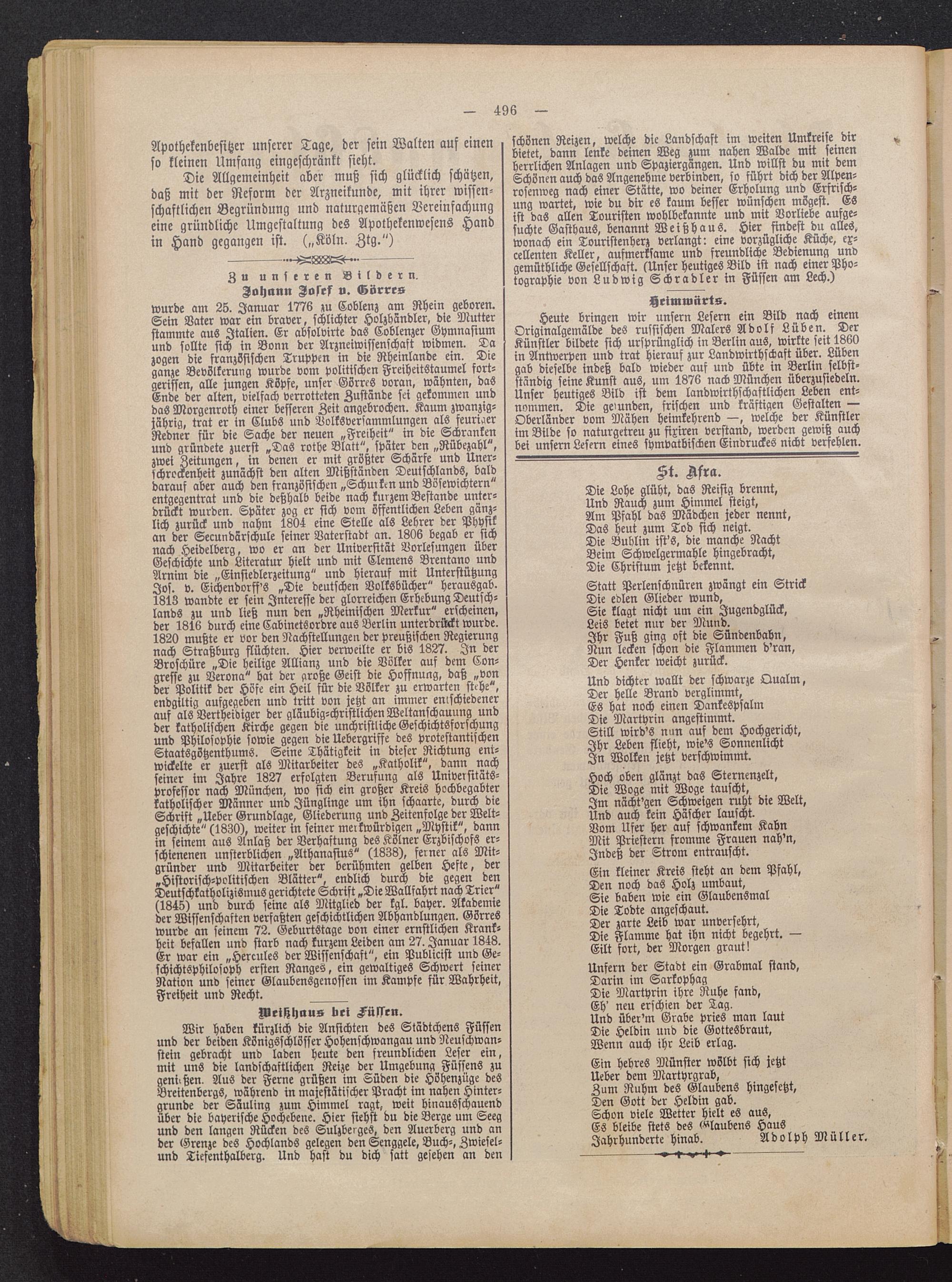 wurde am 25. Januar 1776 zu Coblenz am Rhein geboren.Sein Vater war ein braver, schlichter Holzhändler, die Mutterstammte aus Italien . Er absolvirte das Coblenzer Gymnasiumund sollte sich in Bonn der Arzneiwissenschaft widmen. Dazogen die französischen Truppen in die Rheinlande ein. Dieganze Bevölkerung wurde vom politischen Freiheitstaumel fort-gerissen, alle jungen Köpfe, unser Görres voran, wähnten, dasEnde der alten, vielfach verrotteten Zustände sei gekommen unddas Morgenroth einer besseren Zeit angebrochen. Kaum zwanzig-jährig, trat er in Clubs und Volksversammlungen als feurigerRedner für die Sache der neuen „Freiheit" in die Schrankenund gründete zuerst „Das rothe Blatt", später den „Rübezahl ",zwei Zeitungen, in denen er mit größter Schärfe und Uner-fchrockenheit zunächst den alten Mißständen Deutschlands , balddarauf aber auch den französischen „Schurken und Bösewichtern"entgegentrat und die deßhalb beide nach kurzem Bestände unter-drückt wurden. Später zog er sich vom öffentlichen Leben gänz-lich zurück und nahm 1804 eine Stelle als Lehrer der Physikan der Secundärschule seiner Vaterstadt an. 1806 begab er sichnach Heidelberg , wo er an der Universität Vorlesungen überGeschichte und Literatur hielt und mit Clemens Brentano undArnim die „Einsiedlerzeitung" und hierauf mit UnterstützungJos. v. Eichendorff's „Die deutschen Volksbücher" herausgab.1813 wandte er sein Interesse der glorreichen Erhebung Deutsch-lands zu und ließ nun den „Rheinischen Merkur" erscheinen,der 1816 durch eine Cabinetsordre aus Berlin unterdrückt wurde.1820 mußte er vor den Nachstellungen der preußischen Regierungnach Straßburg flüchten. Hier verweilte er bis 1827. In derBroschüre „Die heilige Allianz und die Völker auf dem Con-gresse zu Verona " hat der große Geist die Hoffnung, daß „vonder Politik der Höfe ein Heil für die Völker zu erwarten stehe",endgtltig aufgegeben und tritt von jetzt an immer emschiedencrauf als Vertheidiger der gläubig-christlichen Weltanschauung undder katholischen Kirche gegen die unchristliche Geschichtsforschungund Philosophie sowie gegen die Hebelgriffe des protestantischenStaatsgötzenthums. Seine Thätigkeit in dieser Richtung ent-wickelte er zuerst als Mitarbeiter des „Katholik", dann nachseiner im Jahre 1827 erfolgten Berufung als Universitäts-professor nach München , wo sich ein großer Kreis hochbegabterkatholischer Männer und Jünglinge um ihn schaarte, durch dieSchrift „Ueber Grundlage, Gliederung und Zeitenfolge der Welt-geschichte" (1830), weiter in seiner merkwürdigen „Mystik", dannin seinem aus Anlaß der Verhaftung des Kölner Erzbischofs er-schienenen unsterblichen „Athanastus" (1838), ferner als Mit-gründer und Mitarbeiter der berühmten gelhen Hefte, der„Historisch-politischen Blätter", endlich durch die gegen denDeutschkatholizismus gerichtete Schrift „Die Wallfahrt nach Trier"(1845) und durch seine als Mitglied der kgl. bayer. Akademieder Wissenschaften verfaßten geschichtlichen Abhandlungen. Görres wurde an seinem 72. Geburtstage von einer ernstlichen Krank-heit befallen und starb nach kurzem Leiden am 27. Januar 1848.Er war ein „Hercules der Wissenschaft", ein Publicist und Ge-schichtsphilosoph ersten Ranges, ein gewaltiges Schwert seinerNation und seiner Glaubensgenossen im Kampfe für Wahrheit,Freiheit und Recht. _