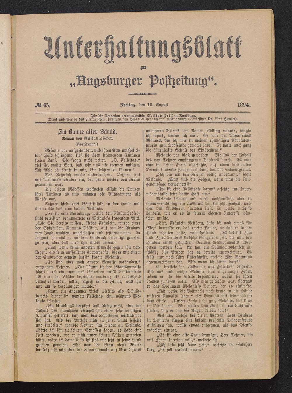 Für die Redaction verantwortlich: Philipp Frick in Augsburg .