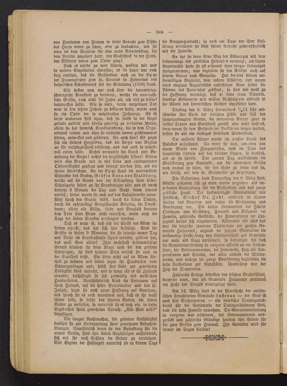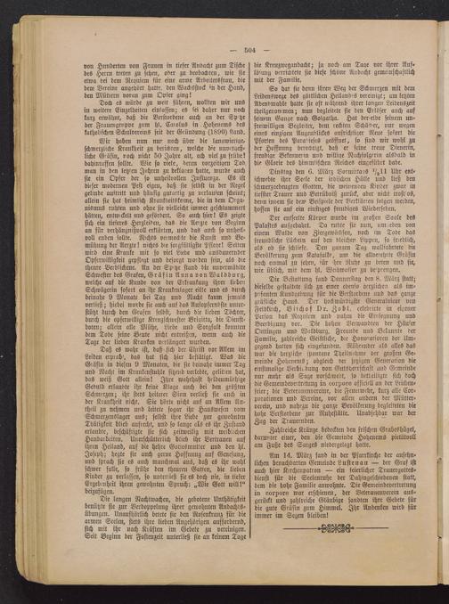 Wir haben nun nur noch über die langwierige,schmerzliche Krankheit zu berichten, welche die unvergeß-liche Gräfin, noch nicht 50 Jahre alt, ach viel zu frühe!dahinraffen sollte. Wie so viele, deren vorzeitigen Todman in den letzten Jahren zu beklaaen hatte, wurde auchsie ein Opfer der so unheilvollen Influenza. Es istdieser modernen Pest eigen, daß sie selbst in der Regelgelinde austeilt und häufig gutartig zu verlauten scheint;allein sie hat heimlich Krankheitskeime, die in dem Orga-nismus ruhten und ohne sie vielleicht immer geschlummerthätten, entwickelt und gefördert. So auch hier! Es zeigtesich ein tieferes Herzleiden, das die Aerzie von Beginnan für verhängnißvoll erklärten, und das auch so unheil-voll enden sollte. Nichts veimochte die Kunst und Be-mühung der Aerzte! nichts die sorgfältigste Pflege! Seltenwird eine Kranke mit so viel Liebe und ausdauernderOpfcrwilligkeit gepflegt und besorgt worden sein, als dietheure Verblichene. An der Sp'tze stand die unvermäblteSchwester des Grafen, Gräfin Anna von Waldburg,welche auf die Kunde von der Erkrankung ihrer liebenSchwägerin sofort an ihr Krankenlager eilte und es durchbeinahe 9 Monate bei Tag und Nacht kaum jemalsverließ; hicbei wurde sie auch auf das Aufopferndste unter-stützt durch den Grafen selbst, durch die lieben Töchter,durch die opferwillige Krcnzschwester Briqitta, die Dienst-boten; allein alle Blühe, Liebe und Sorgfalt konntendem Tode seine Beute nicht entreißen, wenn auch dieTage der lieben Kranken verlängert wurden.
