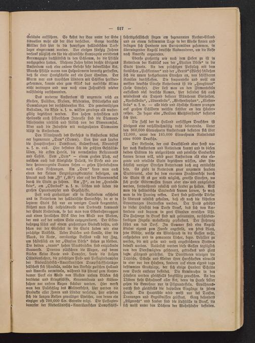Den Mittelpunkt des Verkehrs in Amsterdam bildetoer sogenannte „Dam" (Damm). Von hier aus laufendie Hauptstraßen: Damstraat, Kalversiraat, Nieuvedijku. s. w. aus. Hier befinden sich die größten Geschäfts-läden, die ersten Hotels, die vornehmsten Restaurantsund Cafes. Vom „Dam" — einem großen Platz, aufwelchem auch das Königliche Palais , die Börse und an-dere hervorragende Bauten stehen — gehen Pferdebahnennach allen Richtungen. Am „Dam" kann man aucheinen der kleinen Vergnügungsdampfer besteigen, umhinaus nach dem „N" („Ei") oder auf der Binnenamsteldurch die Stadt zu fahren. Am „N", an der „Handels-kade", am „Osterdock" u. s. w. löschen und laden diegroßen Ozeandampfer und Segelschiffe.