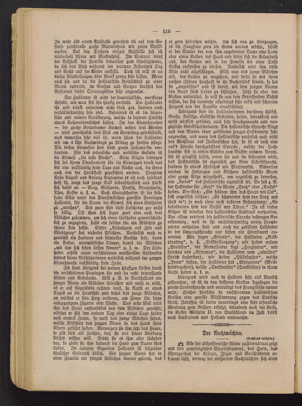 Uebrigcns wird auch in Holland sehr viel Deutschgesprochen, es ist in den besseren Kreisen sozusagen diezweite Landessprache und verdrängt das Französische immermehr. Früher herrschte in verschiedenen holländischenKreisen eine gewisse Mißstimmung gegen das DeutscheReich. Indessen ist darin neuerdings eine sehr erfreulicheWendung zum Bessern erfolgt, besonders nach der Reife»die Kaiser Wilhelm II. von Deutschland im Juli 1891nach Amsterdam und Holland unternahm.