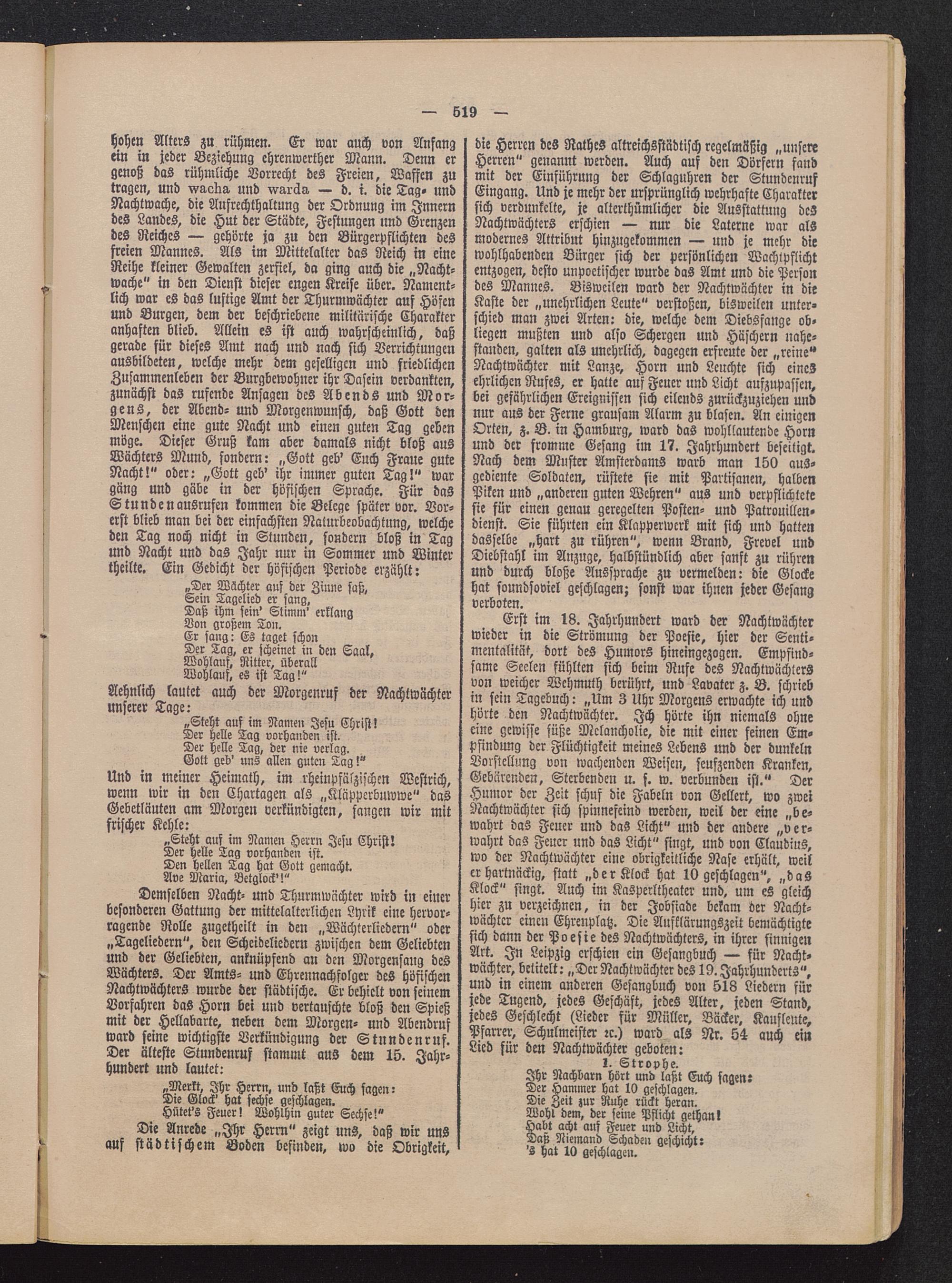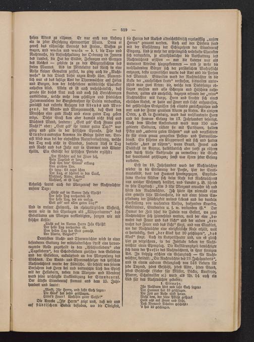 Demselben Nacht- und Thurmwächter wird in einerbesonderen Gattung der mittelalterlichen Lyrik eine hervor-ragende Rolle zugetheilt in den „Wächterliedern" oder„Tageliedern", den Scheideliedern zwischen dem Geliebtenund der Geliebten, anknüpfend an den Morgenfang desWächters. Der Amts- und Ehrennachfolger des höfischenNachtwächters wurde der städtische. Er behielt von seinemVorfahren das Horn bei und vertauschte bloß den Spießmit der Hellabarte, neben dem Morgen- und Abendrufward seine wichtigste Verkündigung der Stundenruf.Der älteste Stundenruf stammt aus dem 15. Jahr-hundert und lautet: