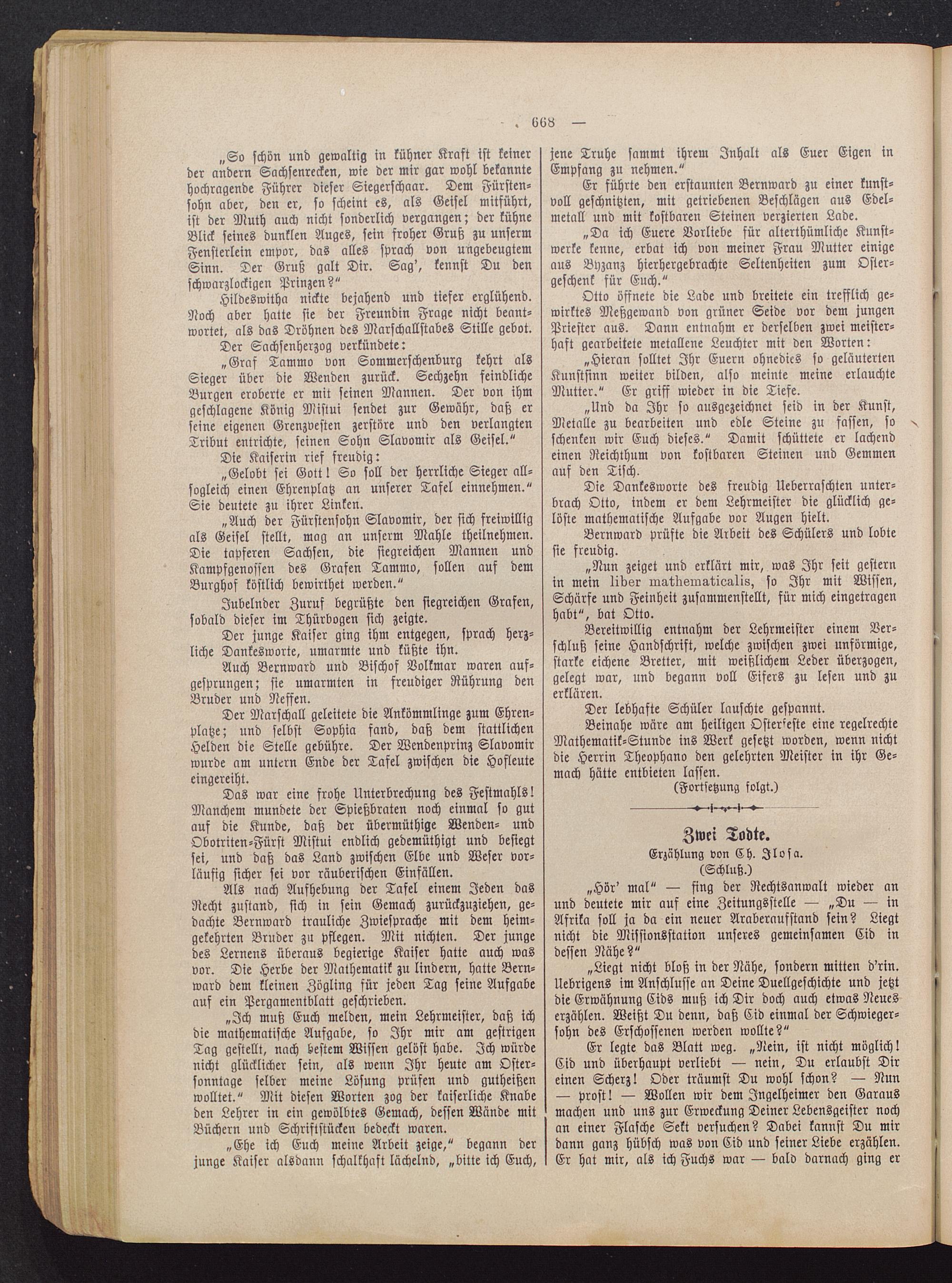 „So schön und gewaltig in kühner Kraft ist keinerder andern Sachsenrecken, wie der mir gar wohl bekanntehochragende Führer dieser Siegerschaar. Dem Fürsten-sohn aber, den er, so scheint es, als Geisel mitführt,ist der Muth auch nicht sonderlich vergangen; der kühneBlick seines dunklen Auges, sein froher Gruß zu unsermFensterlein empor, das alles sprach von ungebeugtemSinn. Der Gruß galt Dir. Sag', kennst Du denschwarzlockigen Prinzen?"