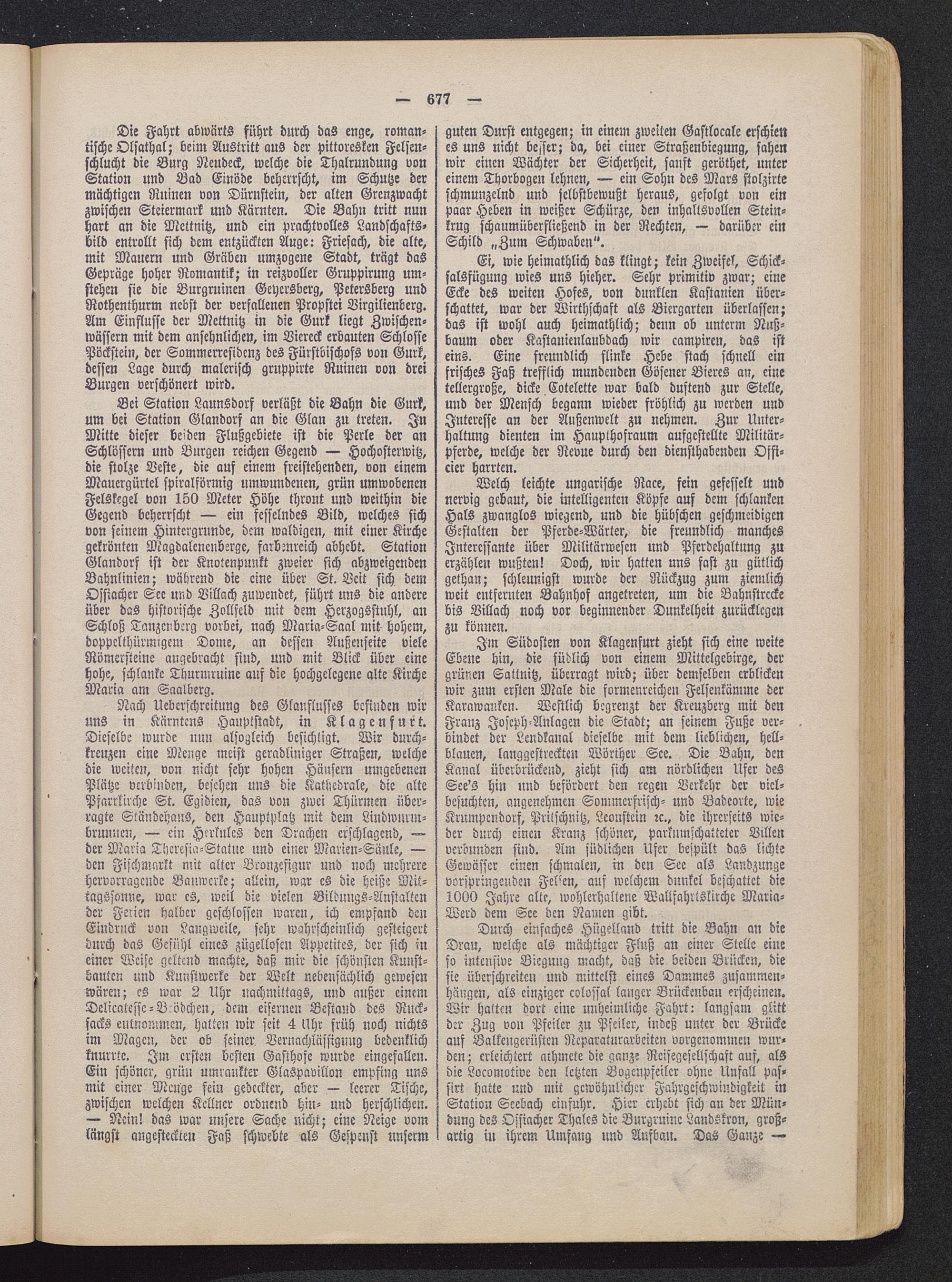 Die Fahrt abwärts führt durch das enge, roman-tische Olsathal; beim Austritt aus der pittoresken Felsen-schlucht die Burg Neudeck, welche die Thalrundung vonStation und Bad Einöde beherrscht, im Schutze dermächtigen Ruinen von Dürnstein , der alten Grenzwachtzwischen Steiermark und Kärnten . Die Bahn tritt nunhart an die Mcttmtz, und ein prachtvolles Landschafts-bild entrollt sich dem entzückten Auge: Friesach , die alte,mit Mauern und Gräben umzogene Stadt, trägt dasGepräge hoher Romantik; in reizvoller Gruppirung um-stehen sie die Burgminen Geyersberg, Petersberg undRothenthurm nebst der verfallenen Propstei Virgilienberg.Am Einflüsse der Mettnitz in die Gurk liegt Zwischen-wässern mit dem ansehnlichen, im Viereck erbauten SchlossePöckstein, der Sommerresidcnz des Fürstbischofs von Gurk ,dessen Lage durch malerisch gruppirte Ruinen von dreiBurgen verschönert wird.