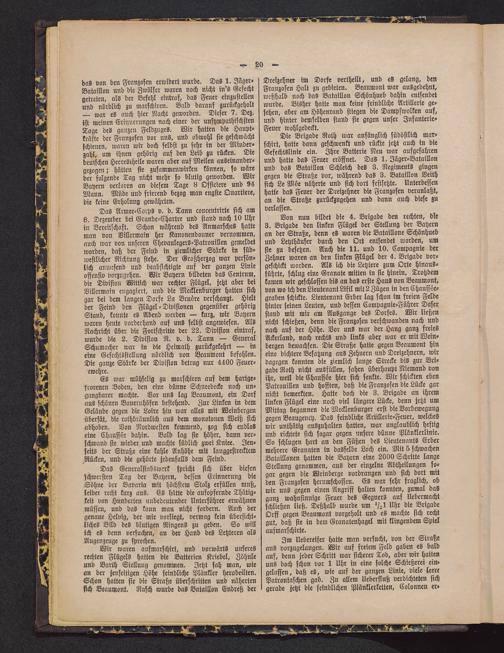 das von den Franzosen erwidert wurde. Das 1. Jäger-Bataillon und die Zwölfer waren noch nicht in's Gefechtgetreten, als der Befehl eintraf, das Feuer einzustellenund nördlich zu marschiren. Bald darauf zurückgeholt— war es auch hier Nacht geworden. Dieser 7. Dez.ist meinen Erinnerungen nach einer der unsympathischstenTage des ganzen Feldzuges. Wir hatten die Haupt-kräfte der Franzosen vor uns, und obwohl sie geschwächtschienen, waren wir doch selbst zu sehr in der Minder-zahl, um ihnen gehörig auf den Leib zu rücken. Diedeutschen Hecresihcile waren aber auf Meilen ausetnander-gezogen; hätten sie zusammenwirken können, so wäreder folgende Tag nicht mehr so blutig geworden. WirBayern verloren an diesem Tage 8 Officiere und 94Mann. Müde und frierend bezog man engste Quartiere,die keine Erholung gewährten.