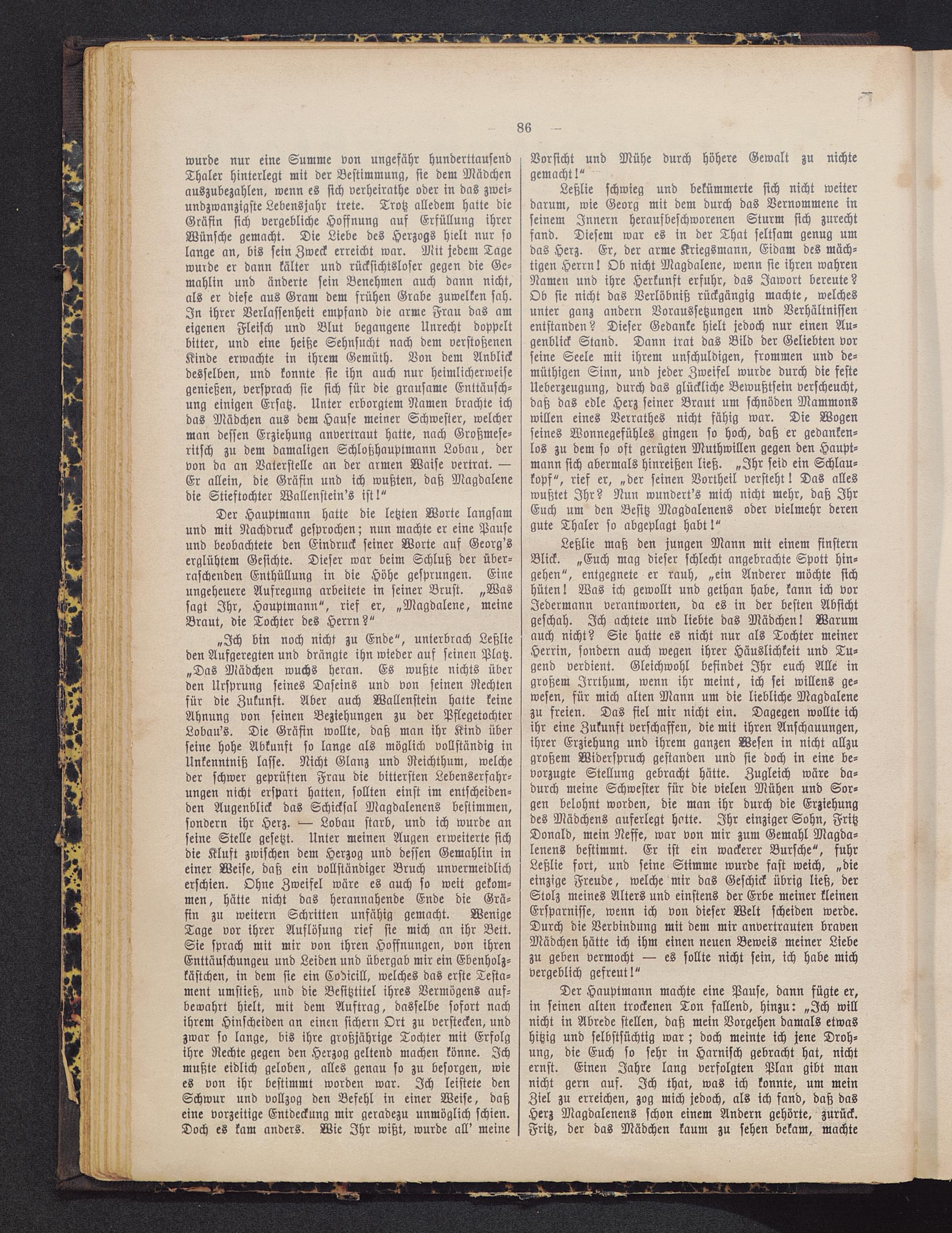 wurde nur eine Summe von ungefähr hunderttausendThaler hinterlegt mit der Bestimmung, sie dem Mädchenauszubezahlen, wenn es sich verheirathe oder in das zwei-undzwanzigste Lebensjahr trete. Trotz alledem hatte dieGräfin sich vergebliche Hoffnung auf Erfüllung ihrerWünsche gemacht. Die Liebe des Herzogs hielt nur solange an, bis sein Zweck erreicht war. Mit jedem Tagewurde er dann kälter und rücksichtsloser gegen die Ge-mahlin und änderte sein Benehmen auch dann nicht,als er diese aus Gram dem frühen Grabe zuweilen sah.In ihrer Verlassenheit empfand die arme Frau das ameigenen Fleisch und Blut begangene Unrecht doppeltbitter, und eine heiße Sehnsucht nach dem verstoßenenKinde erwachte in ihrem Gemüth. Von dem Anblickdesselben, und konnte sie ihn auch nur heimlicherweisegenießen, versprach sie sich für die grausame Enttäusch-ung einigen Ersatz. Unter erborgtem Namen brachte ichdas Mädchen aus dem Hause meiner Schwester, welcherman dessen Erziehung anvertraut hatte, nach Großmese-ritsch zu dem damaligen Schloßhauptmann Lobau, dervon da an Vaterstelle an der armen Waise vertrat. —Er allein, die Gräfin und ich wußten, daß Magdalenedie Stieftochter Wallenstein's ist!"