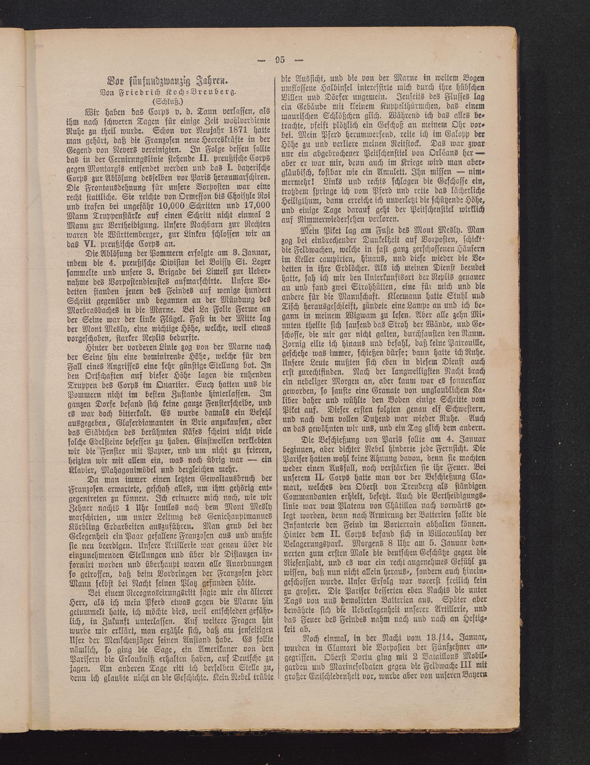 Hinter der vorderen Linie zog von der Marne nachder Seine hin eine dominirende Höhe, welche für denFall eines Angriffes eine sehr günstige Stellung bot. Inden Ortschaften auf dieser Höhe lagen die ruhendenTruppen des Corps im Quartier. Such hatten uns diePommern nicht im besten Zustande hinterlassen. Imganzen Dorfe befand sich keine ganze Fensterscheibe, undes war doch bitterkalt. Es wurde damals ein Befehlausgegeben, Glaserdiamantcn in Brie anzukaufen, aberdas Städtchen des berühmten Käses scheint nicht vielesolche Edelsteine besessen zu haben. Einstweilen verklebtenwir die Fenster mit Papier, und um nicht zu frieren,heizten wir mit allem ein, waS noch übrig war — einKlavier, Mahagonimöbel und dergleichen mehr.