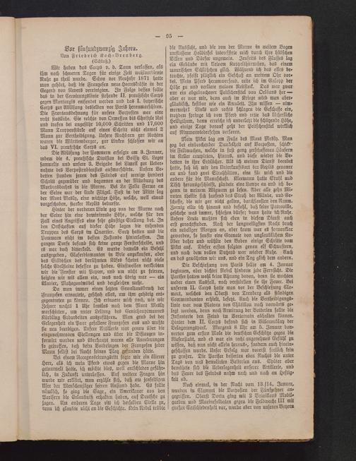 Die Beschießung von Paris sollte am 4. Januarbeginnen, aber dichter Nebel hinderte jede Fernsicht. DiePariser hatten wohl keine Ahnung davon, denn sie machtenweder einen Ausfall, noch verstärkten sie ihr Feuer. Beiunserem II. Corps hatte man vor der Beschießung Cla-mart, welches den Oberst von Trcnberg als ständigenCommandanten erhielt, besetzt. Auch die Vertheidigungs-linie war vom Plateau von Chutillon nach vorwärts ge-legt worden, denn nach Armirung der Batterien sollte dieInfanterie den Feind im Vorterrain abhalten können.Hinter dem II. Corps befand sich in Villaconblay derVelagerungspark. Morgens 8 Uhr am 5. Januar don-nerten zum ersten Male die deutschen Geschütze gegen dieRiesenstadt, und es war ein recht angenehmes Gefühl zuwissen, daß nun nicht allein heraus-, sondern auch hinein-geschossen wurde. Unser Erfolg war vorerst freilich keinzu großer. Die Pariser besserten eben Nachts die unterTags von uns demolirten Batterien aus. Später aberbewährte sich die Ueberlsgenheit unserer Artillerie, unddas Feuer des Feindes nahm nach und nach an Heftig-keit ab.