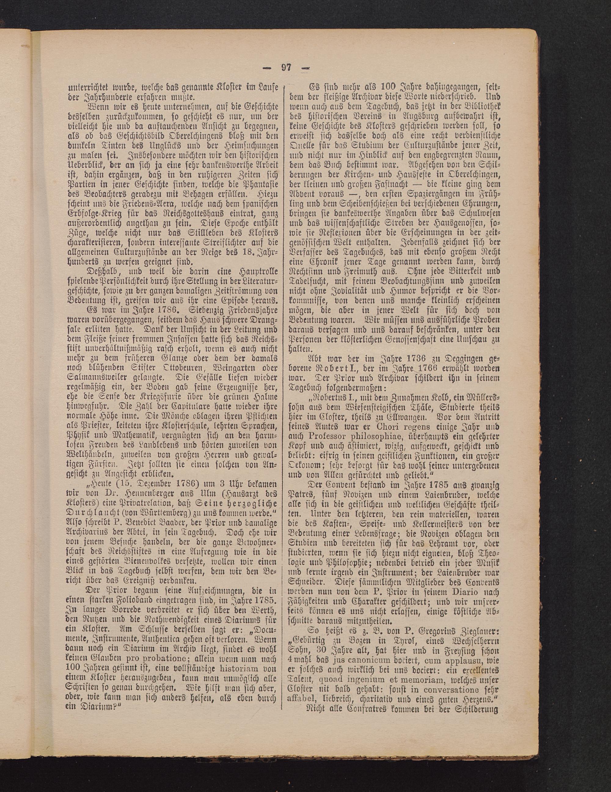 Der Prior begann seine Aufzeichnungen, die ineinen starken Foliobaud eingetragen sind, im Jahre 1785.Zn langer Vorrede verbreitet er sich über den Werth,den Nutzen und die Nothwendigkeit eines Diariums fürein Kloster. Am Schlüsse derselben sagt er: „Docu-meute, Instrumente, Authentica gehen oft verloren. Wennbaun noch ein Diarium im Archiv liegt, findet es wohlkeinen Glauben pro probatiouo; allein wenn man nach100 Jahren gesinnt ist, eine vollständige llistoriam voneinem Kloster herauszugeben, kann man unmöglich alleSchriften so genau durchgehen. Wie hilft man sich aber,oder, wie kann man sich anders helfen, als eben durchein Diarium?"