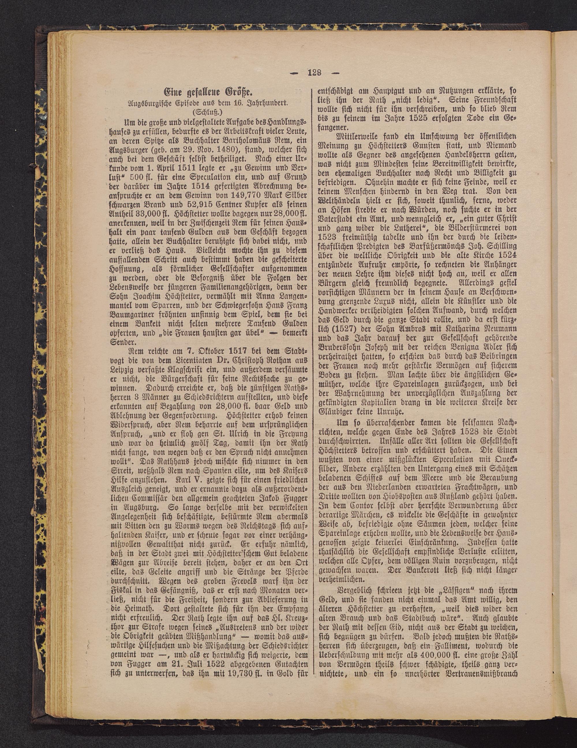 Um die große und vielgestaltete Aufgabe des Handlungs-hauses zu erfüllen, bedurfte es der Arbeitskraft vieler Leute,an deren Spitze als Buchhalter Bartholomäus Nem, einAugsburger (geb. am 29. Nov. 1480), stand, welcher sichauch bet dem Geschäft selbst betheiliget. Nach einer Ur-kunde vom 1. April 1511 legte er „zu Gewinn und Ver-lust" 500 fl. für eine Speculation ein, und auf Grundder darüber im Jahre 1514 gefertigten Abrechnung be-anspruchte er an dem Gewinn von 149,770 Mark Silber schwarzen Brand und 52,915 Centner Kupfer als seinenAntheil 33,000 fl. Höchstetter wollte dagegen nur 28,000 fl.anerkennen, weil in der Zwischenzeit Rem für seinen Haus-halt ein paar tausend Gulden aus dem Geschäft bezogenhatte, allein der Buchhalter beruhigte sich dabei nicht, under verließ das Haus. Vielleicht mochte ihn zu diesemauffallenden Schritt auch bestimmt haben die gescheiterteHoffnung, als förmlicher Gesellschafter aufgenommenzu werden, oder die Besorgniß über die Folgen derLebensweise der jüngeren Familienangehörigen, denn derSohn Joachim Höchstetter, vermahlt mit Anna Langen-mantel vom Sparren, und der Schwiegersohn Hans FranzBaumgartner fröhnten unsinnig dem Spiel, dem sie beieinem Bankett nicht selten mehrere Tausend Guldenopferten, und „die Frauen hausten gar übel" — bemerktSender.
