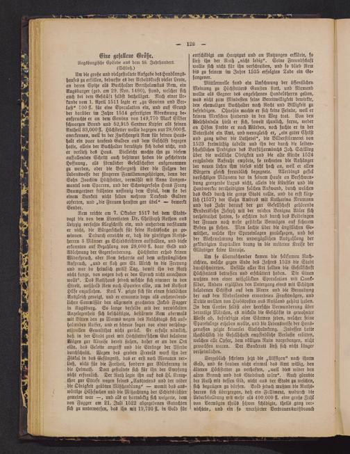 Mittlerweile fand ein Umschwung der öffentlichenMeinung zu Höchstetters Gunsten statt, und Niemandwollte als Gegner des angesehenen Handelsherrn gelten,was nicht zum Mindesten seine Bereitwilligkeit bewirkte,den ehemaligen Buchhalter nach Recht und Billigkeit zubefriedigen. Ohnehin machte er sich keine Feinde, weil erkeinem Menschen hindernd in den Weg trat. Von denWelthändeln hielt er sich, soweit thunlich, ferne, wederan Höfen strebte er nach Würden, noch suchte er in derVaterstadt ein Amt, und wenngleich er, „ein guter Christund ganz wider die Lutherei", die Bilderstürmerei von1523 freimüthig tadelte und ihn der durch die leiden-schaftlichen Predigten des Barfüßermönchs Joh. Schillingüber die weltliche Obrigkeit und die alte Kirche 1524entzündete Aufruhr empörte, so rechneten die Anhängerder neuen Lehre ihm dieses nicht hoch an, weil er allenBürgern gleich freundlich begegnete. Allerdings gefielvorsichtigen Männern der in seinem Hause an Verschwen-dung grenzende Luxus nicht, allein die Künstler und dieHandwerker vertheidigten solchen Aufwand, durch welchendas Geld durch die ganze Stadt rollte, und da erst kürz-lich (1527) der Sohn Ambras mit Katharina Neumannund das Jahr darauf der zur Gesellschaft gehörendeBruderssohn Joseph mit der reichen Benigna Adler sichverheirathet hatten, so erschien das durch das Beibringender Frauen noch mehr gestärkte Vermögen auf sicheremBoden zu stehen. Man lachte über die ängstlichen Ge-müther, welche ihre Spareinlagen zurückzogen, und beider Wahrnehmung der unverzüglichen Auszahlung dergekündigten Kapitalien drang in die weiteren Kreise derGläubiger keine Unruhe.