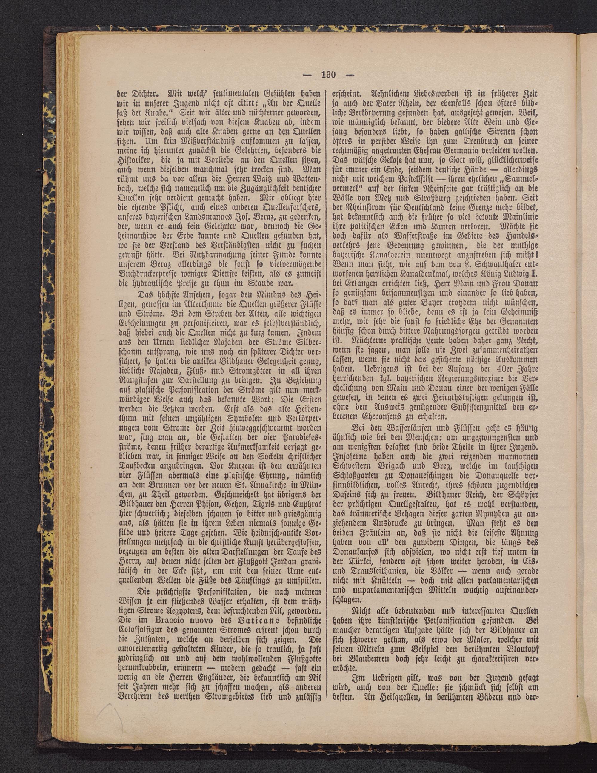 der Dichter. Mit welch' sentimentalen Gefühlen habenwir in unserer Jugend nicht oft citirt: „An der Quellesaß der Knabe." Seit wir älter und nüchterner geworden,sehen wir freilich vielfach von diesem Knaben ab, indemwir wissen, daß auch alte Knaben gerne an den Quellensitzen. Um kein Mißverständniß aufkommen zu lassen,meine ich hierunter zunächst die Gelehrten, besonders dieHistoriker, die ja mit Vorliebe an den Quellen sitzen,auch wenn dieselben manchmal sehr trocken sind. Manrühmt uns da vor allem die Herren Waitz und Watten-bach, welche sich namentlich um die Zugänglichkeit deutscherQuellen sehr verdient gemacht haben. Mir obliegt hierdie ehrende Pflicht, auch eines anderen Quellenforschers,unseres bayerischen Landsmannes Jos. Beraz, zu gedenken,der, wenn er auch kein Gelehrter war, dennoch die Ge-heimarchive der Erde kannte und Quellen gefunden hat,wo sie der Verstand des Verständigsten nicht zu suchengewußt hätte. Bei Nutzbarmachung seiner Funde konnteunserem Beraz allerdings die sonst so viclvermögendeBuchdruckerpresse weniger Dienste leisten, als es zumeistdie hydraulische Presse zu thun im Stande war.