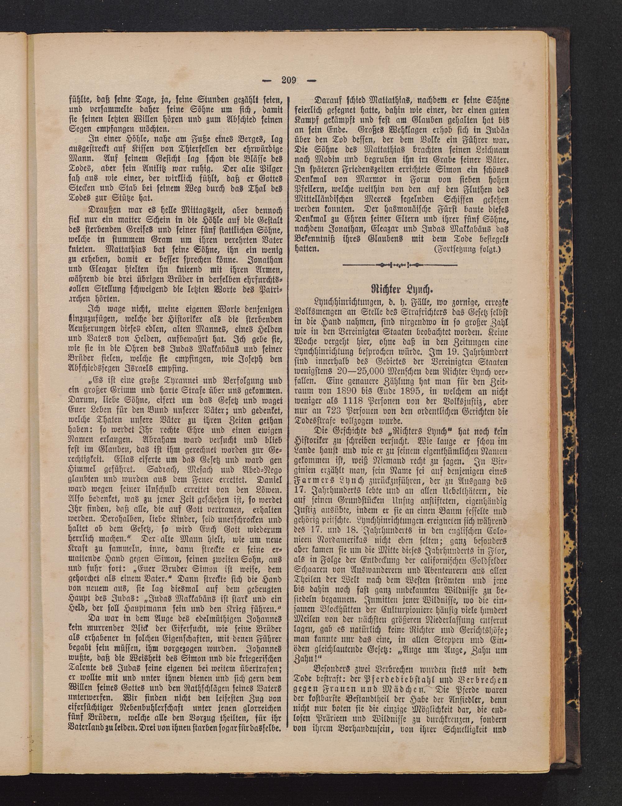 Die Geschichte des „Richters Lynch" hat noch keinHistoriker zu schreiben versucht. Wie lange er schon imLande haust und wie er zu seinem eigenthümlichen Namengekommen ist, weiß Niemand recht zu sagen. In Vir-ginien erzählt man, sein Name sei auf denjenigen einesFarmers Lynch zurückzuführen, der zu AnSgang des17. Jahrhunderts lebte und an allen Ucbelthätcrn, dieauf seinen Grundstücken Unfug anstifteten, eigenhändigJustiz ausübte, indem er sie an einen Baum fesselte undgehörig peitschte. Lynchhinrichtungen ereigneten sich währenddes 17. und 18. Jahrhunderts in den englischen Colo-niecn Nordamerikas nicht eben selten; ganz besondersaber kamen sie um die Mitte dieses Jahrhunderts in Flor,als in Folge der Entdeckung der kalifornischen GoldfelderSchaarcu von Auswanderern und Abenteurern aus allenTheilen der Welt nach dem Westen strömten und jenebis dahin noch fast ganz unbekannten Wildnisse zu be-siedeln begannen. Inmitten jener Wildnisse, wo die ein-samen Blockhütten der Culturpiouiere häufig viele hundertMeilen von der nächsten größeren Niederlassung entferntlagen, gab cS natürlich keine Richter und Gerichtshöfe;man kannte nur das eine, in allen Steppen und Ein-öden gleichlautende Gesetz: „Auge um Auge, Zahn umZahn!"