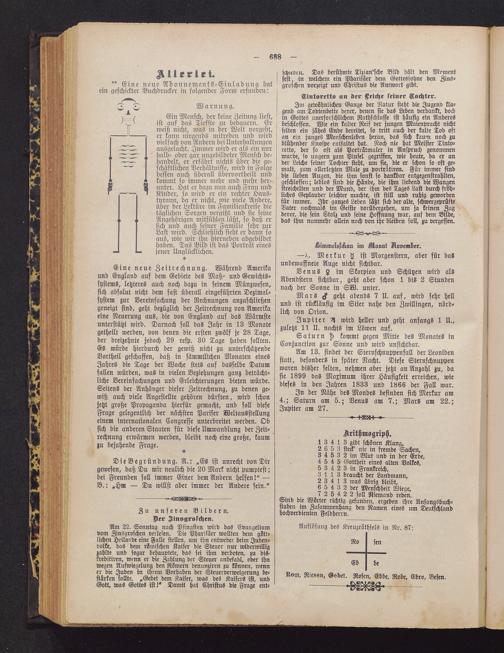 Am 13. findet der Sternschnuppenfall der Leonidenstatt, besonders in später Nacht. Diese Sternschnuppenwaren bisher selten, nehmen aber jetzt an Anzahl zu, dasie 1899 das Maximum ihrer Häufigkeit erreichen, wiedieses in den Jahren 1833 und 1866 der Fall war.