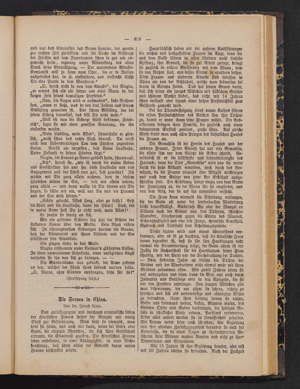 Das zurückgezogene und durchaus orientalische Lebender chinesischen Frauen liefert der Neugier nur wenigStoff zur Befriedigung. Man sieht sie niemals, manhört sie selten, und auch nur dann, wenn der Vater oderGatte, die einzigen Menschen, die sich ihrer Gesellschafterfreuen, die Erlaubniß gcgcbrn. Die chinesischen Frauenleben unbekannt, in einer Abhängigkeit, in einer Nicht-beachtung, daß schon allein der Gedanke daran unsereFrauen erschrecken würde.