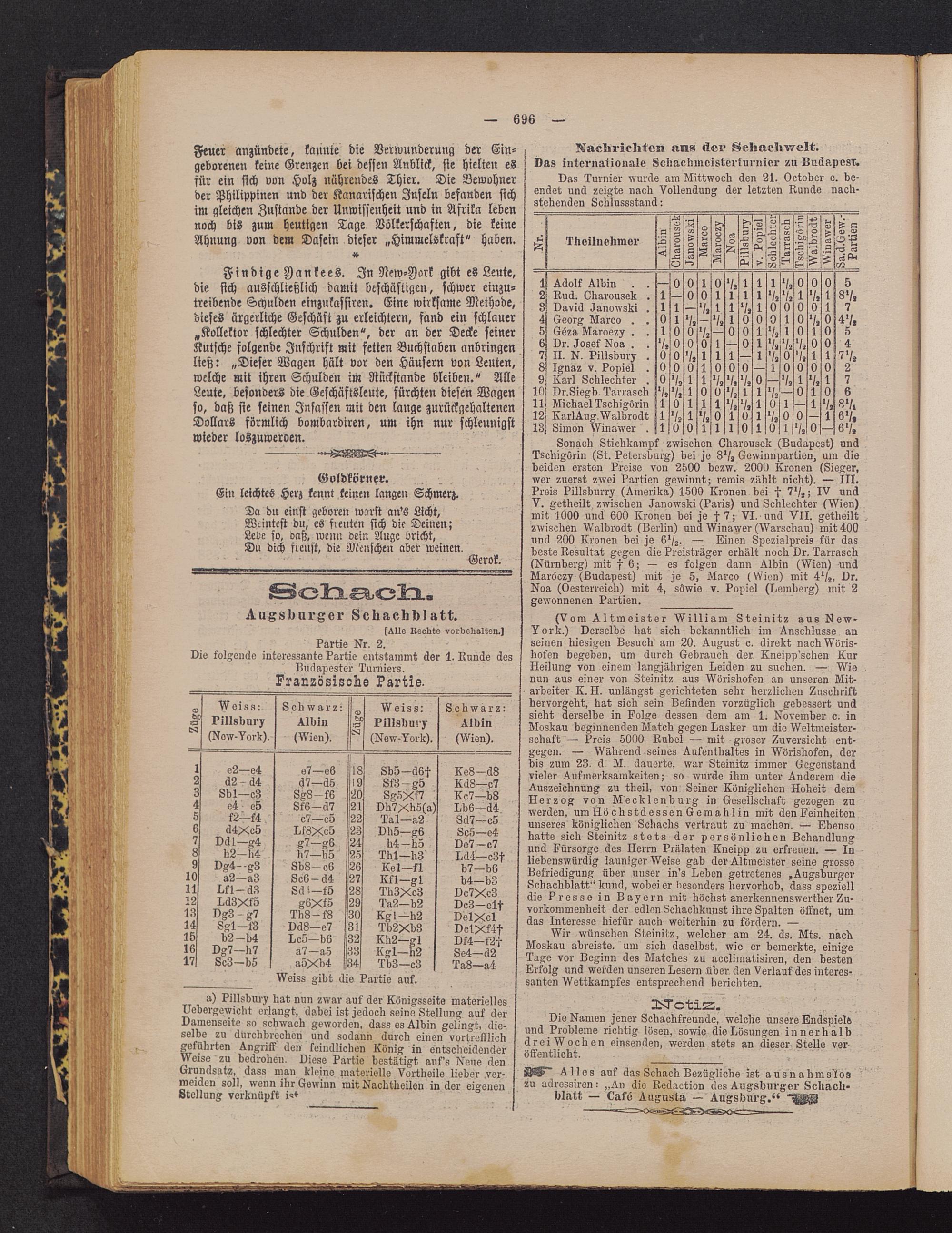 (Vom Kltmeistsr William Stsinitr aus New-Vork.) Derselbe bat sieb bekanntlieb im rlnseblusss anseinen bissigen Lesueb am 20. August o. direkt naekWöris-botsn begeben, um dureb Oebrauek der Kneipp'seben KurHeilung von einem langjäbrigen Beiden ru sneben. — Wienun aus einer von Stsinitr aus Wörisboten an unseren lVlit-arbsiter K. II. unlängst geriobteten sebr berrlioben 2nsebrittbervorgebt, bat sieb sein Befinden vorrüglieb gebessert undsiebt derselbe in kolgs dessen dem am 1. November c. inNoskau beginnenden Nateb gegen Basksr um die Weltmeister-sebatt — kreis 5000 Rubel — mit groser Auversiebt ent-gegen. — Wäbrend seines llukentbaltss in Wörisboksn, derbis rum 23. d LI. dauerte, war Stsinitr immer 6egenstandvisier Aufmerksamkeiten; so wurde ibm unter Anderem die^usreiebnung ru tbeil, von Seiner Küniglieben Ilobeit demIlsrrog von die eklen bürg in Osssllsekatt gezogen auwerden, um llöobstdossen Osmablin mit den l?sinbeitenunseres königliobsn Sebaebs vertraut ru maebsn. — Kbsnsodatts sieb Stsinitr stets der xorsönlioben Lebandlungund kürsorgo des Herrn krälaten Kneipp ru erfreuen. — Inliebenswürdig launiger Weiss gab der Altmeister seine grosseBefriedigung über unser in's Beben getretenes »LugsburgerSebaebblatt" kund, wobei er besonders bervorbob, dass specielldie kresse in Bauern mit böebst anerkennenswertber 2u-vorkommenbeit der edlen Scbacbknnst ibro Spalten ölknet, umdas Interesse kisfür aueb weiterbin ru fördern. —