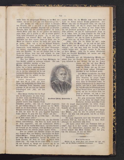 Herr Wilmer durchstreifte eine kurzeZeit allein den Wald, dann sah er diehellen Gewänder der jungen Damendurch das dunkle Waldesgrün schim-mern, hörte ihr silberhelles Lachen, diewitzigen Scherzworte der sie umgebendenHerren, und als er, selbst unbemerkt,sah, daß Georgine den Mittelpunkt dieserkleinen Gruppe bildete, zog er sich schnellzurück, um von der anderen Seite denHügel zu besteigen, auf dem er seineCousine mit der armen Rosalie wußte.