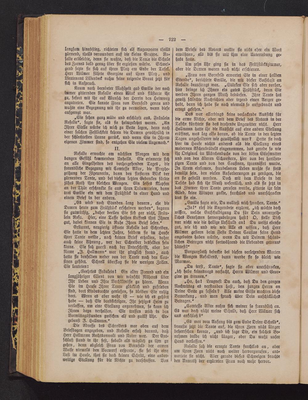 Die Adresse des Schreibers war oben auf demBriefbogen angegeben, und Nosalie ersah daraus, daßHerr Hollmann NechtSanwalt und Notar war. Der Ent-schluß stand in ihr fest, sobald als möglich zu ihm zugehen, denn obgleich Frau von Vornfeld der armenWaise niemals den Vorwarf ersparte, sie sei ihr eineLast im Hause, that sie doch keinen Schritt, eine ander-weitige Stellung für die Nichte zu verschaffen. Von