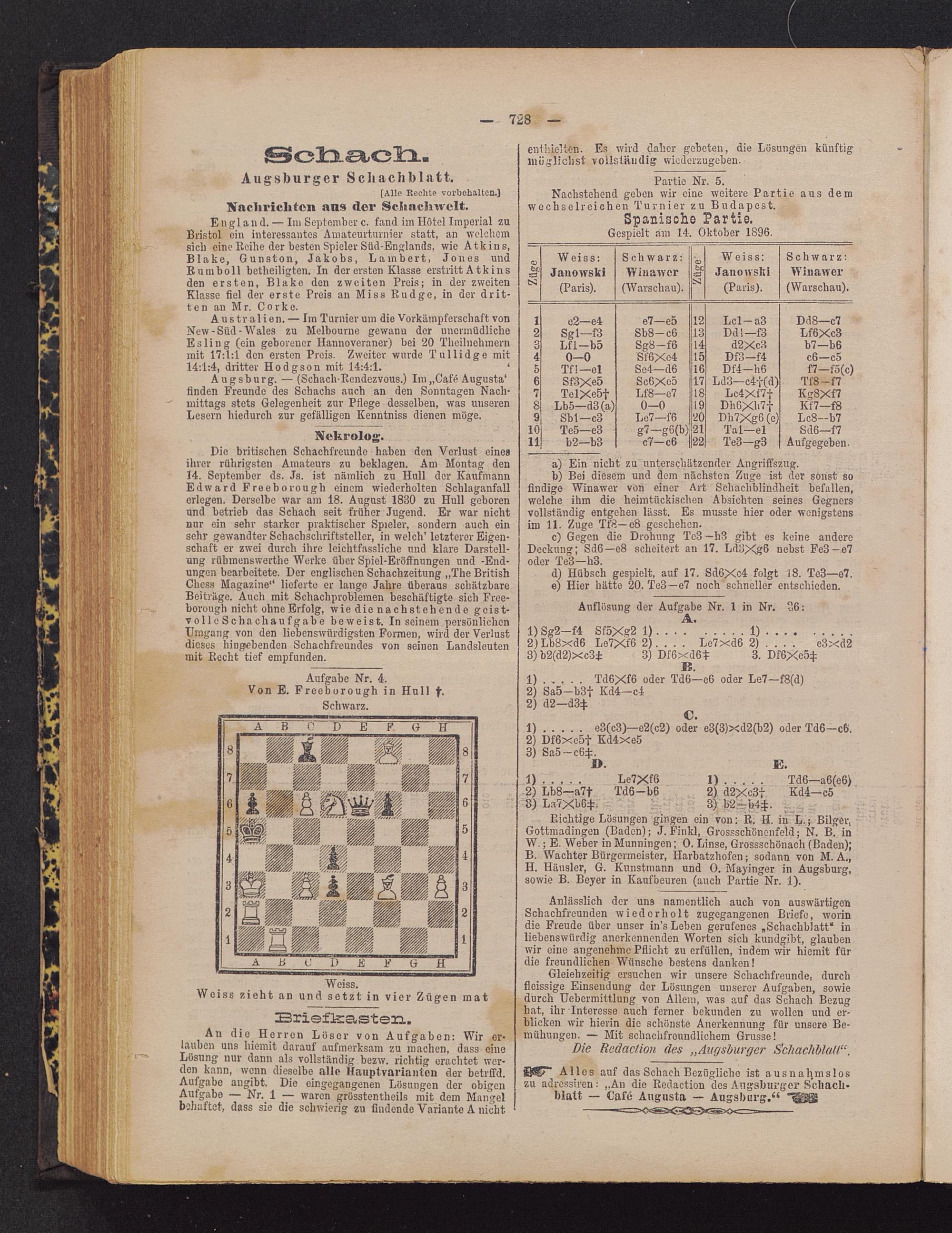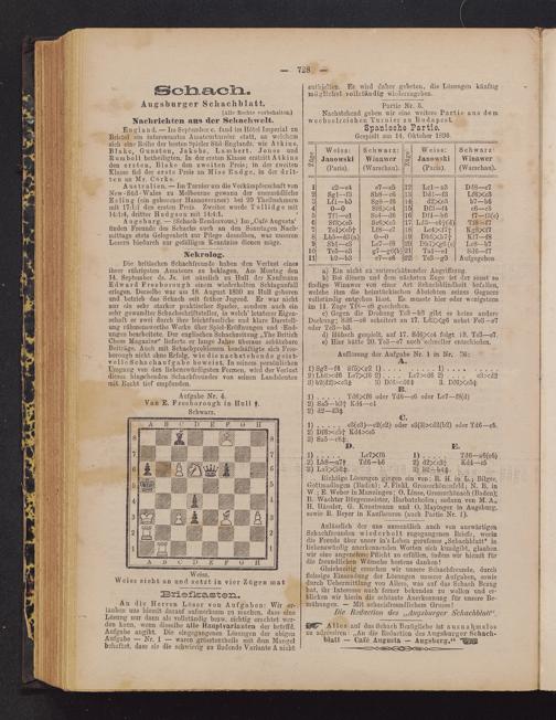 Die Redaction des ,, Augsburger Schachblatt".Alles auf das Schach Bezügliche ist ausnahmsloszu adressiren: ,, An die Redaction des Augsburger Schach-blatt Café AugustaAugsburg."