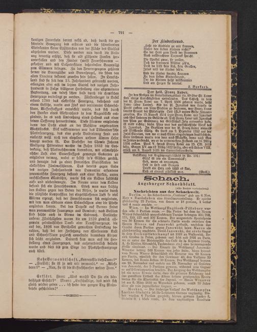 kantigen Feuerstein derart rasch ab, daß durch die ge-schwinde Bewegung des ersteren und die schneidendenSteinkanten kleine Splitterchen von der Fläche des Stahlesabgehoben werden. Diese werden nun durch die Reib-ung derartig erhitzt, daß sie als glühende Funken her-unterfallen und den Zunder (meist Feuerfchwamm —gekochter und mit Salpetersäure behandelter Baumpilz)zum Glimmen bringen. Zu den Feuererzeugern gehörenferner die Brenngläser und Brennspicgel, die schon denalten Traciern bekannt gewesen sein sollen. In Deutsch-land sind sie seit dem 13. Jahrhundert gebraucht worden,erlangten aber erst im letzten Viertel des vorigen Jahr-hunderts in Folge billigerer Herstellung eine allgemeinereVerbreitung, um indeß schon bald durch die chemischenFeuerzeuge verdrängt zu werden. Fürstenberger in Basel erfand 1780 das elektrische Feuerzeug, bestehend auseinem Gefäße, worin aus Zink und verdünnter Schwefel-säure, Wasserstoffgas entwickelt wurde, das sich durchden Funken eines Elektrophors in dem Augenblicke ent-zündete, da es nach Umdrehung eines Hahnes aus einerfeinen Qeffnung hervorströmte. Diese Flamme entzündetedann den Docht eines an der Maschine angebrachtenWachsstockes. Viel vollkommener war das Döbereiner'schePlatinfeuerzeug, das eine große Verbreitung fand undvielleicht wohl noch von einzelnen unserer älteren Leserbenutzt worden ist. Der Professer der Chemie JohannWolfgang Döbrreiner machte im Jahre 1832 die Ent-deckung, daß Platinaschwamm brennbare, mit athmosphä-rischer Luft oder Sauerstoffgas gemengte Gasarten zuentzünden vermag, wobei er selbst in's Glühen geräth,und benutzte daL zu einer sinnreichen Modifikation derelektrischen Zündmaschienen. Das bereits gegen Endedes vorigen Jahrhunderts von Dumontier erfundenepneumatische Feuerzeug bestand aus einer starken, untenverschlossenen Glasröhre, worin sich ein Kolben luftdichtauf- und niederbewegte. Im Raume unter dem Kolbenbefand sich ein Feuerfchwamm. Stieß man nun kräftigden Kolben gegen den Boden der Röhre, so wurde durchdie plötzliche Kompression der eingeschlossenen Luft so vielWärme erzeugt, daß der Feuerfchwamm sich entzündete,mit dem man alsdann einen Schwefelspan oder die Pfeifeanzünden konnte. Bet den Dayaks auf Borneo findetman pneumatische Feuerzeuge aus Bambus; nach Bastiansind solche auch in Birma im Gebrauch. Vorläuferunserer Zündhölzchen waren die um 1820 ziemlich all-gemein gebräuchlichen Tunk- oder Tauchfeuerzeuge, dieauf der, 1806 von Berthollet gemachten Entdeckung be-ruhten, daß bei der Zersetzung von chlorsaurem Kaliund Schwefelsäure zugleich anwesende brennbare Körpersich leicht entzünden. Dadurch kam man auf die Her-stellung eines Feuerzeuges, das außerordentlich beliebtwurde und dies bis zum Siege der Phosphorfeuerzeugeauch blieb.