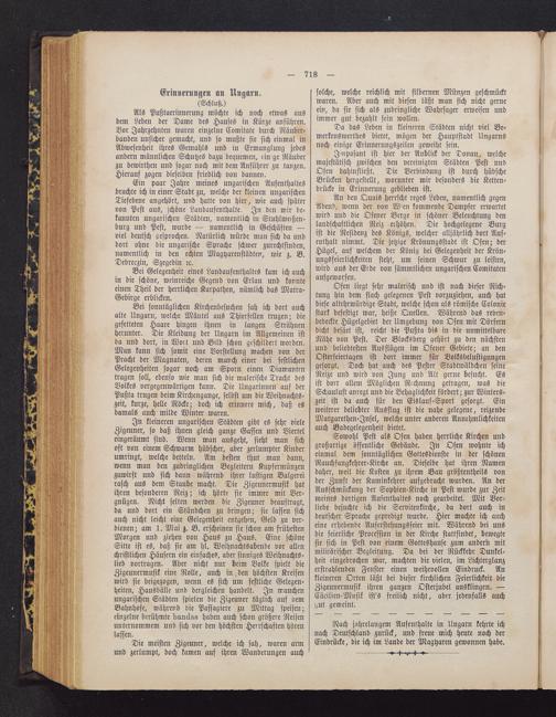 Sowohl Pest als Ofen haben herrliche Kirchen undgroßartige öffentliche Gebäude. In Ofen wohnte icheinmal dem sonntäglichen Gottesdienste in der schönenRauchfangkehrer-Kirche an. Dieselbe hat ihren Namendaher, weil die Kosten zu ihrem Bau größtentheils vonder Zunft der Kaminkehrer aufgebracht wurden. An derAusschmückung der Sophien-Kirche in Pest wurde zur Zeitmeines dortigen Aufenthaltes noch gearbeitet. Mit Vor-liebe besuchte ich die Scrvitenkirche, da dort auch indeutscher Sprache gepredigt wurde. Hier machte ich aucheine erhebende Aufcrstehungsfeier mit. Während bei unsdie feierliche Procession in der Kirche stattfindet, bewegtesie sich in Pest von einem Gottcshause zum andern mitmilitärischer Begleitung. Da bei der Rückkehr Dunkel-heit eingebrochen war, machten die vielen, im Lichterglanzerstrahlenden Fenster einen weihevollen Eindruck. Ankleineren Orten läßt bei dieser kirchlichen Feierlichkeit dieZigeunermusik ihren ganzen Osterjubel ausklingen. —Cäcilien-Musik ist's freilich nicht, aber jedenfalls auchgut gemeint.