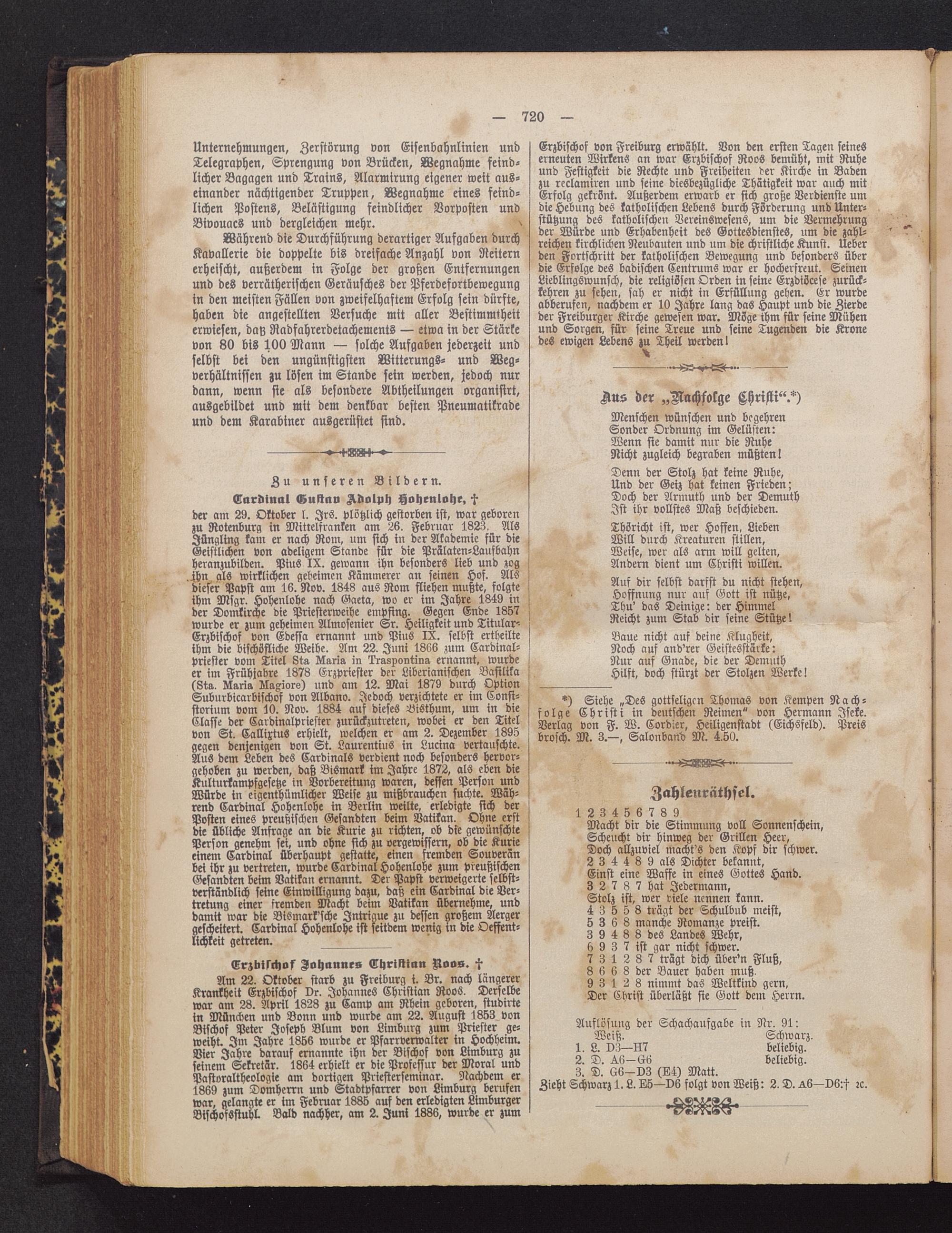 Am 22. Oktober starb zu Freiburg i. Br. nach längererKrankheit Erzbischof Dr. Johannes Christian Roos . Derselbewar am 28. April 1828 zu Camp am Rhein geboren, studirtein München und Bonn und wurde am 22. August 1853 vonBischof Peter Joseph Blum von Limburg zum Priester ge-weiht. Im Jahre 1856 wurde er Pfarrverwalter in Hochheim .Vier Jahre darauf ernannte ihn der Bischof von Limburg zuseinem Sekretär. 1864 erhielt er die Professur der Moral undPastoraltheologie am dortigen Priesterseminar. Nachdem er1869 zum Domherrn und Stadtpfarrcr von Limburg berufenwar, gelangte er im Februar 1885 auf den erledigten LimburgerBischofsstuhl. Bald nachher, am 2. Juni 1886, wurde er zum